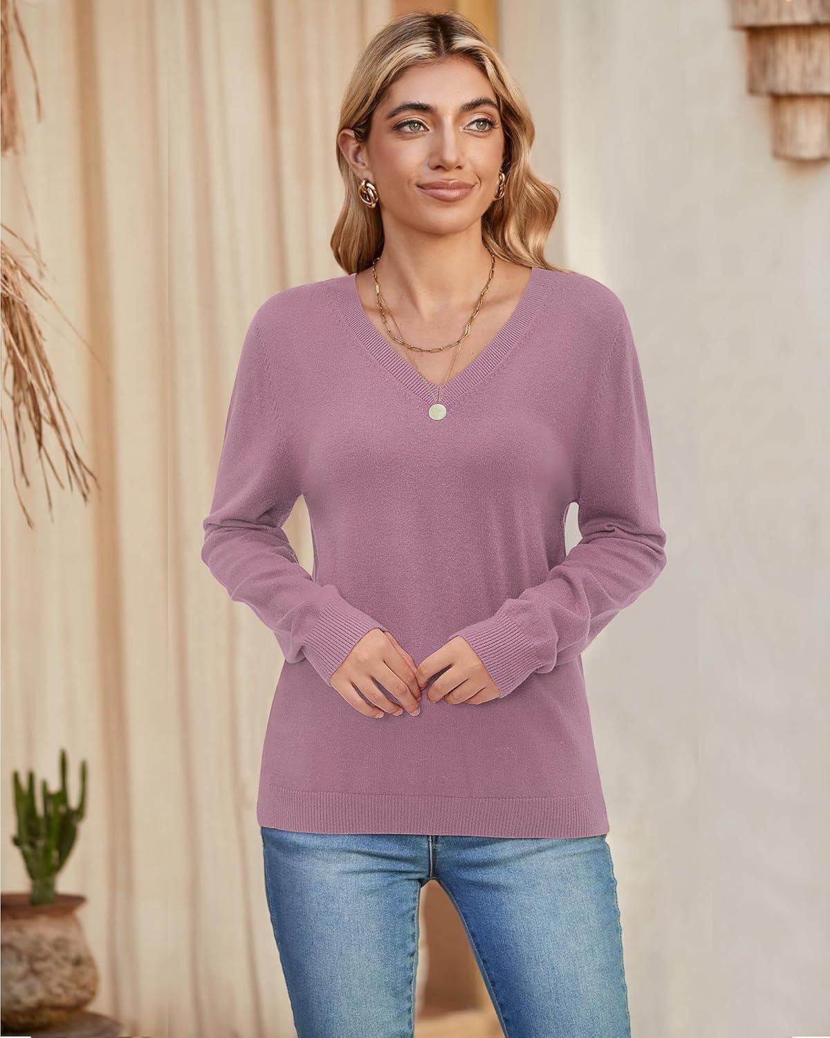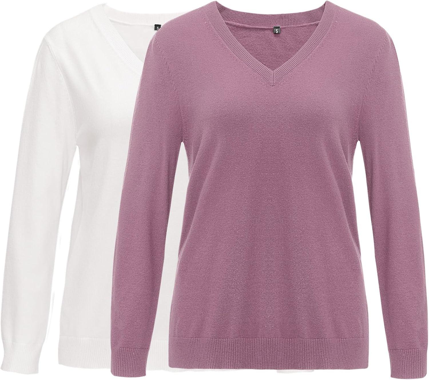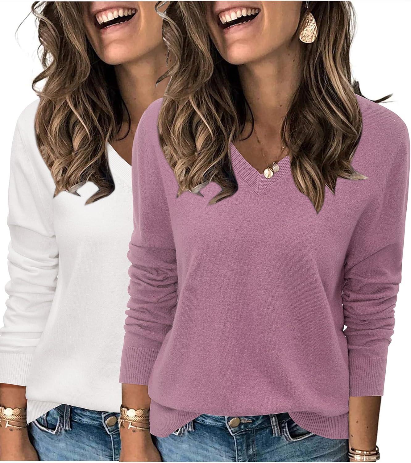 Arach&Cloz 2 Pack Womens Sweaters 2024 Lightweight Soft V Neck Long Sleeve Fall Tops Fashion Clothes Casual Shirts Pullover(Off White+grey Purple)