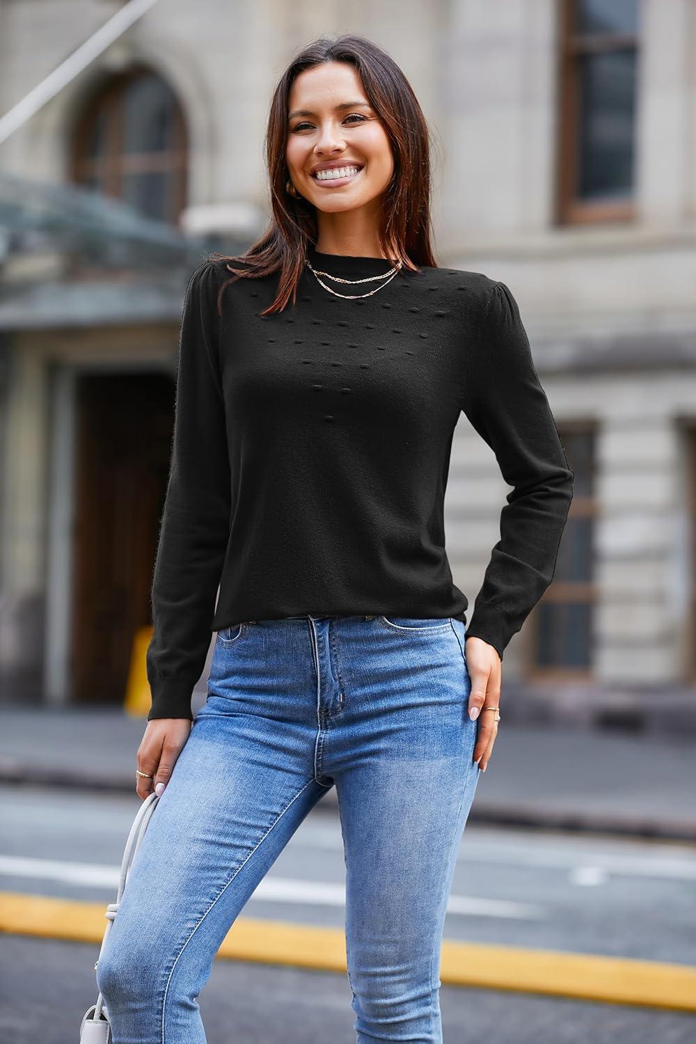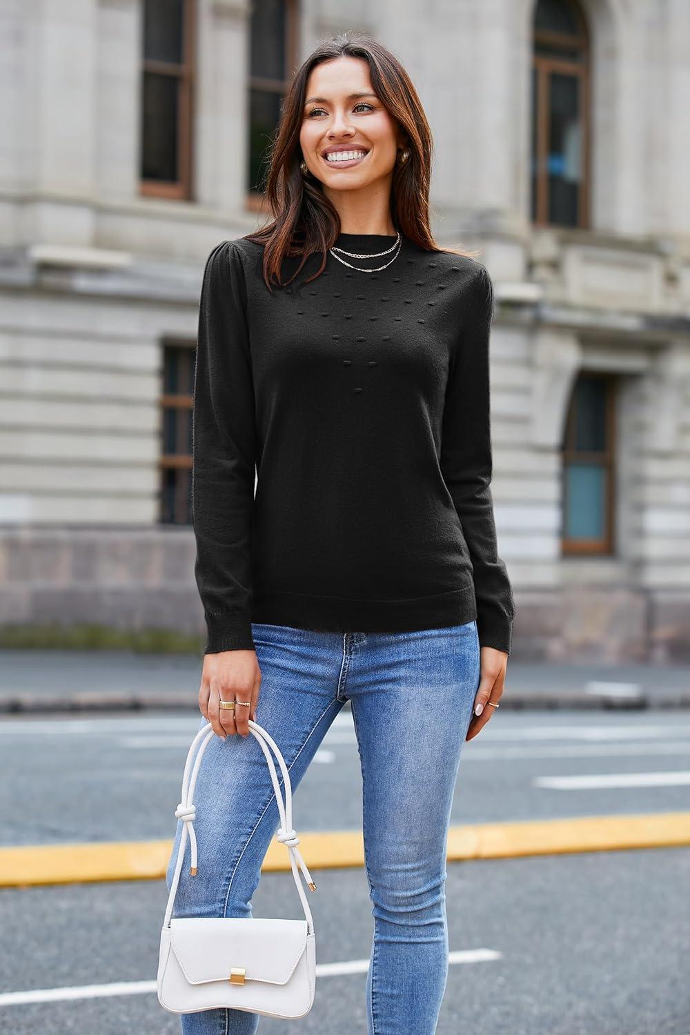 Arach&Cloz 2024 Fall Sweaters Long Puff Sleeve Tops Crew Neck Special Dots Trendy Casual Lightweight Pullover Clothes Outfits(Black)