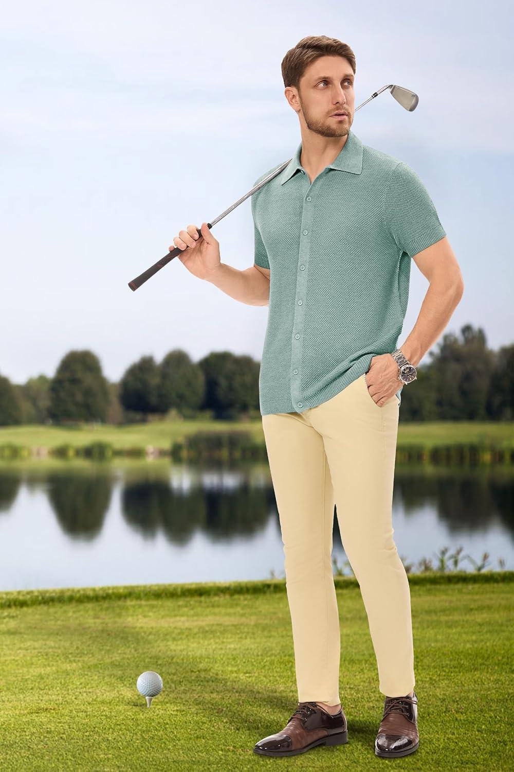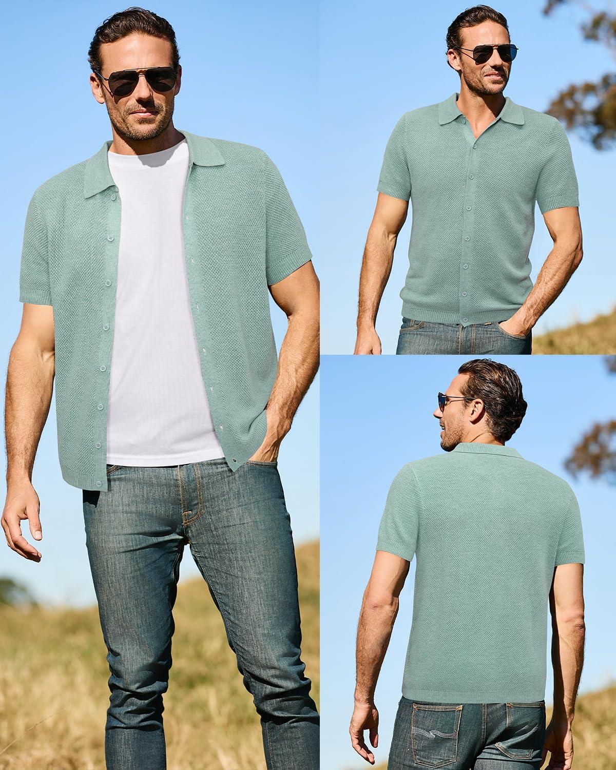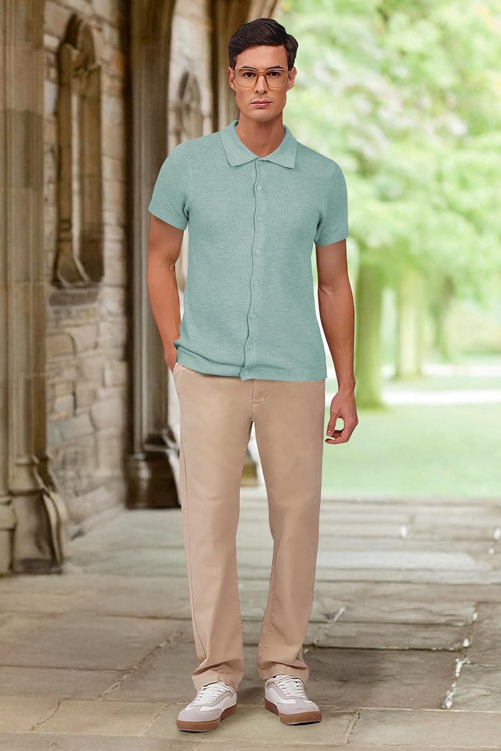 Arach&Cloz Mens Wool Blended Button Down Shirt Short Sleeve Knit 2025 Summer Fashion Dress Shirts Casual Business Golf(Light Green)