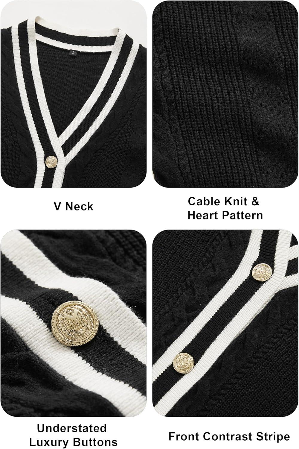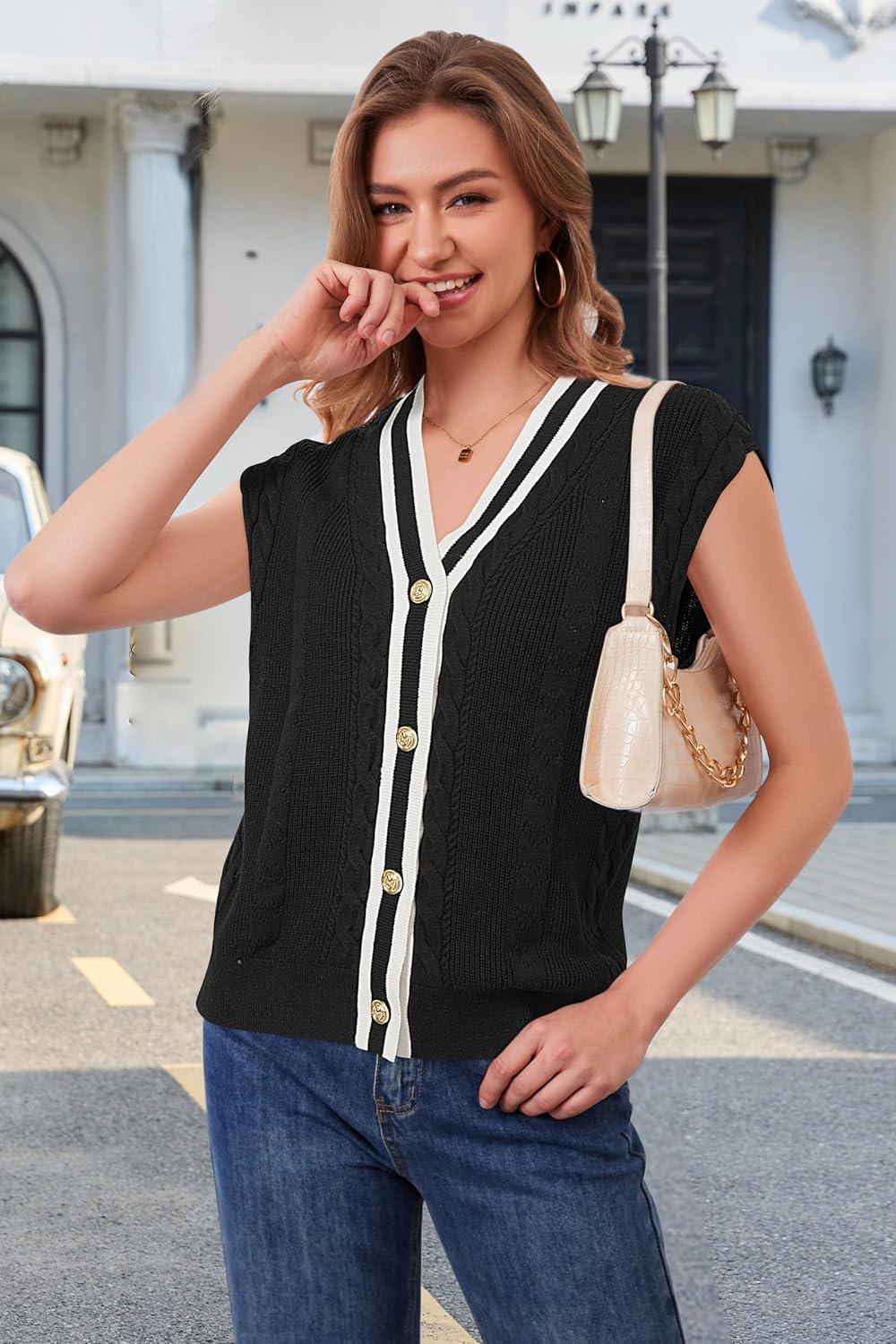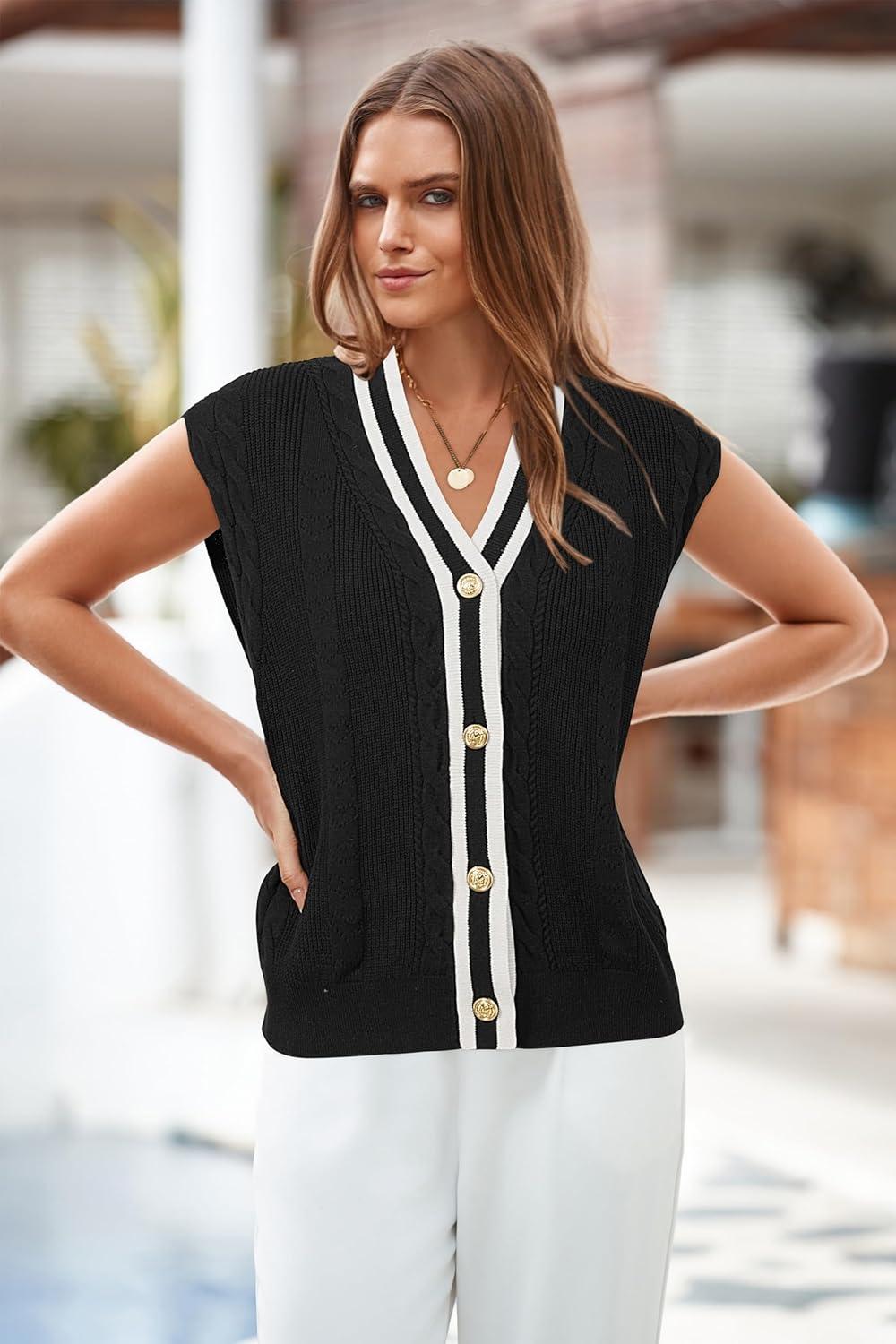 Arach&Cloz Summer Sweater Vest Women Spring Cap Sleeve V Neck Striped Button Casual Cardigan Sweater Knit Tank Tops 2025(Black-white)