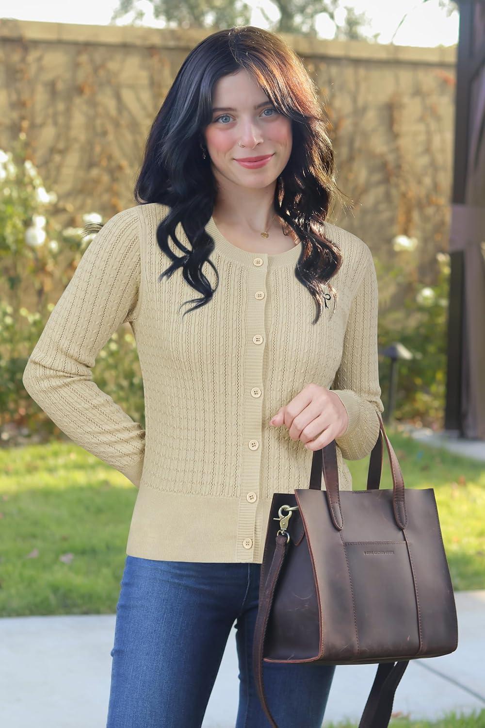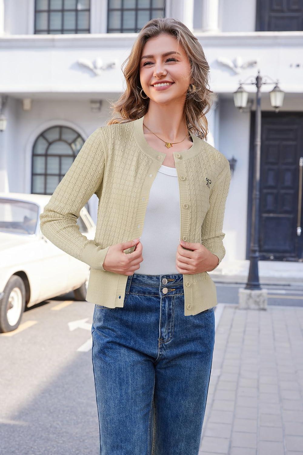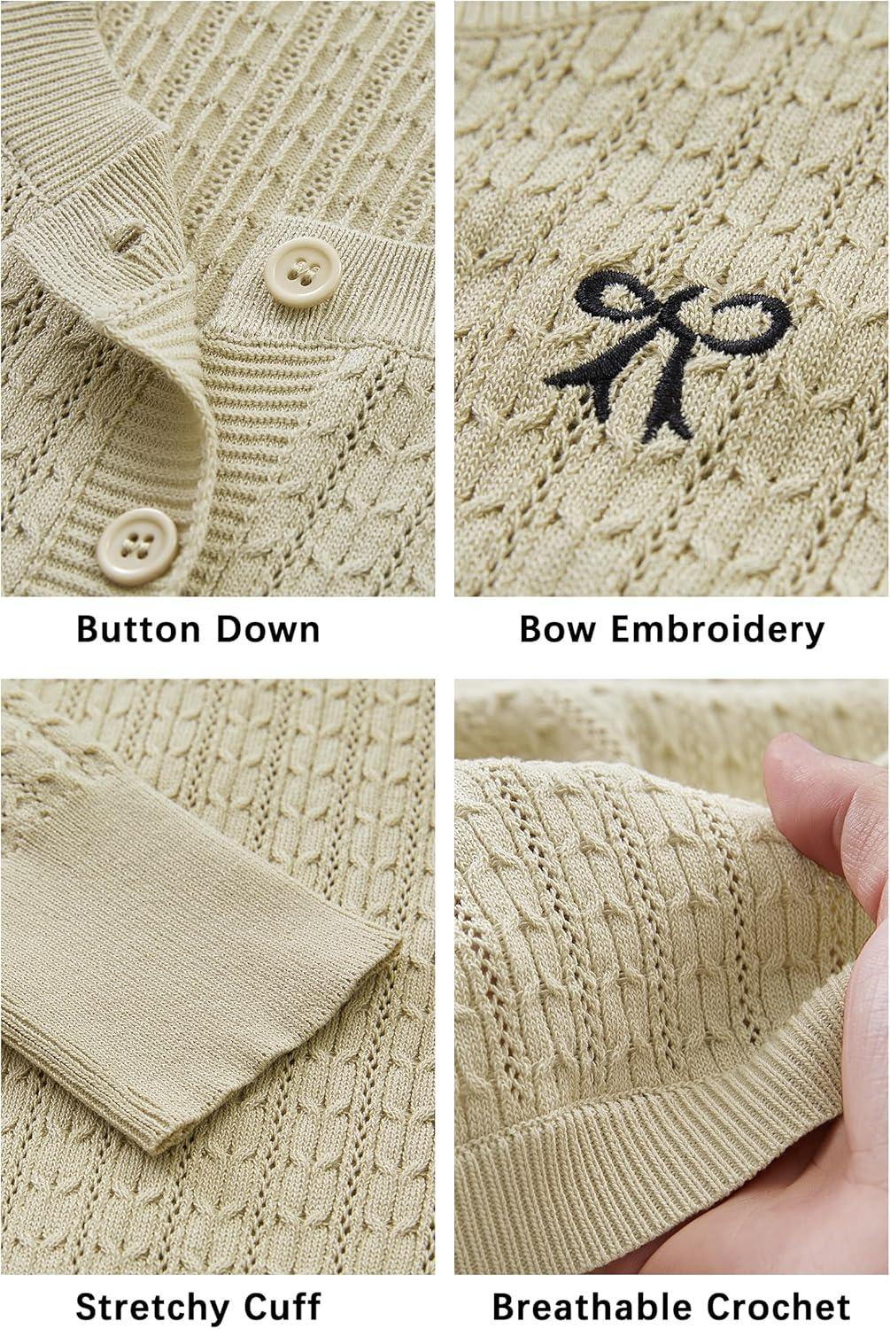 Arach&Cloz Womens 2025 Summer Lightweight Cardigan Long Sleeve Cable Knit Hollow Out Bow Embroidery Tops(Beige)