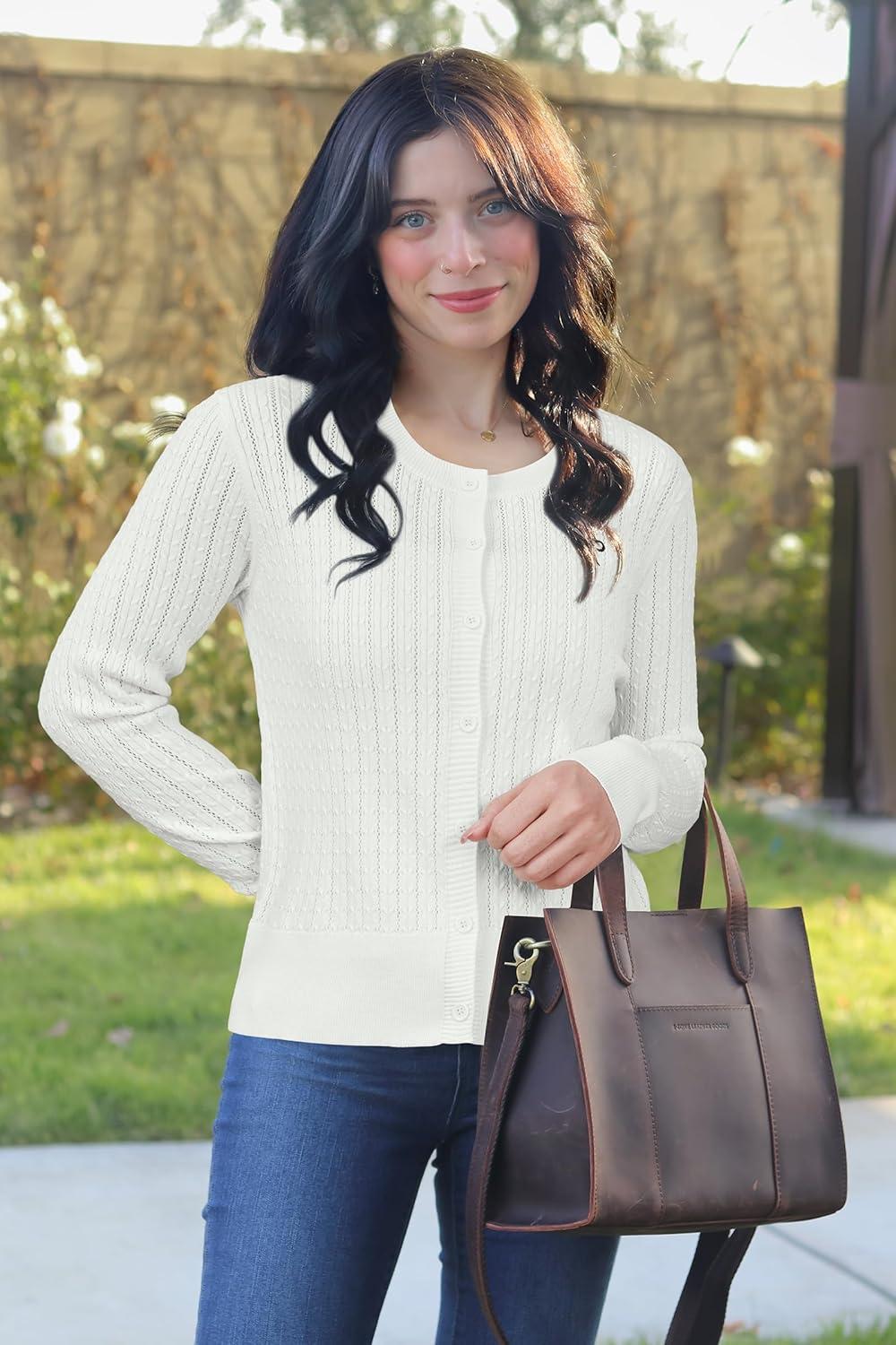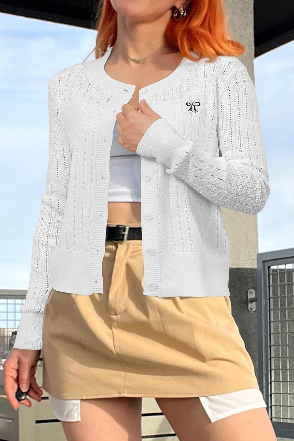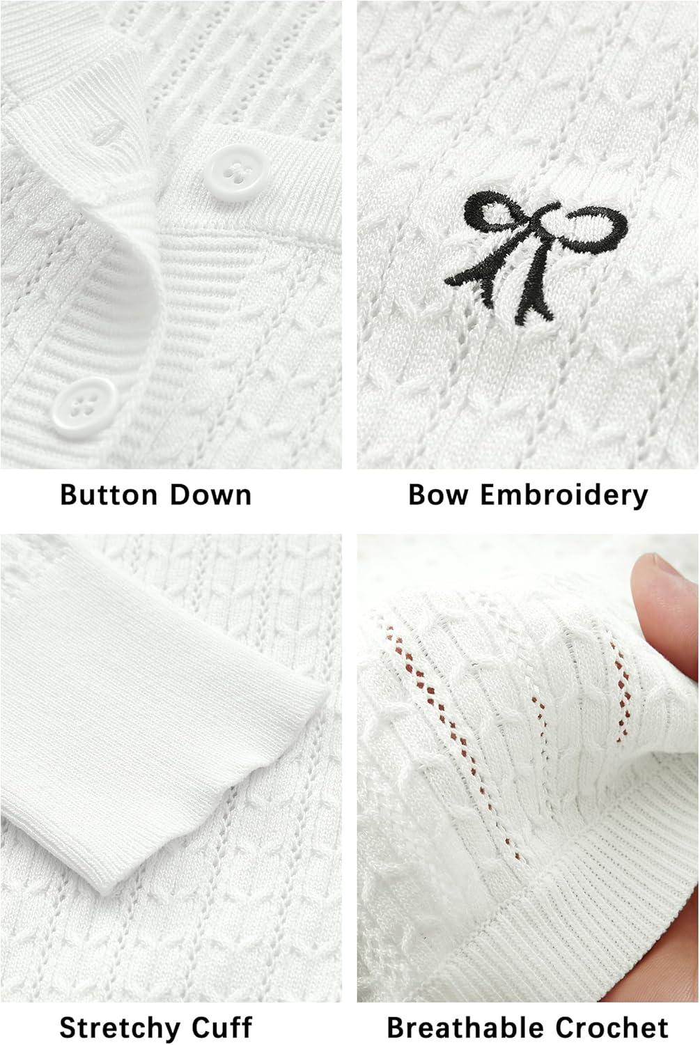 Arach&Cloz Womens 2025 Summer Lightweight Cardigan Long Sleeve Cable Knit Hollow Out Bow Embroidery Tops(Off-white)