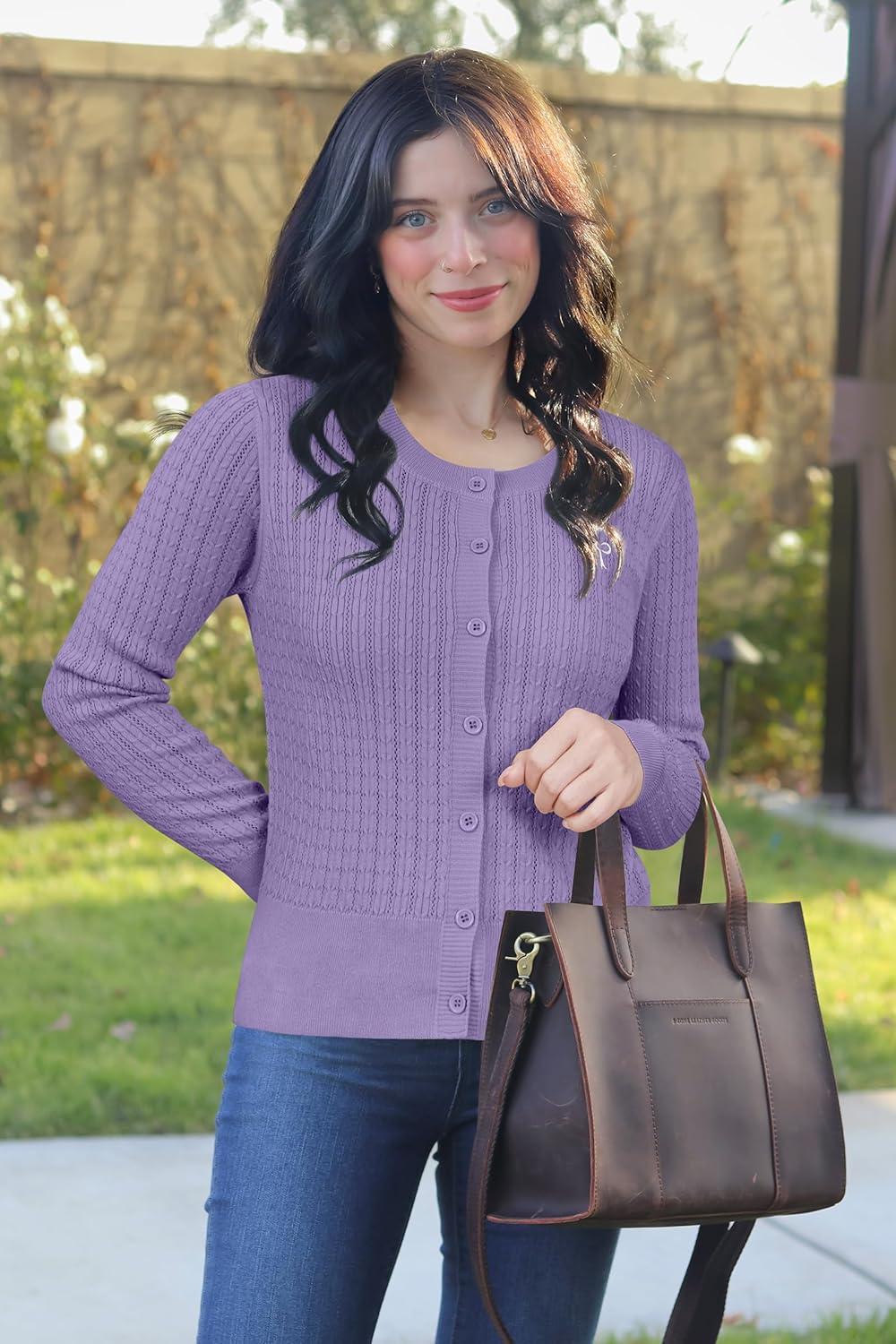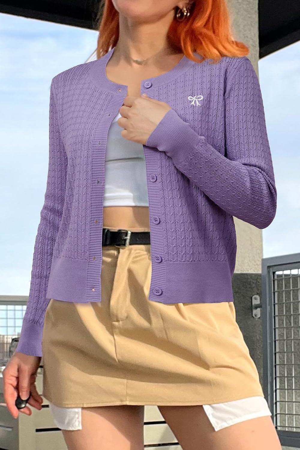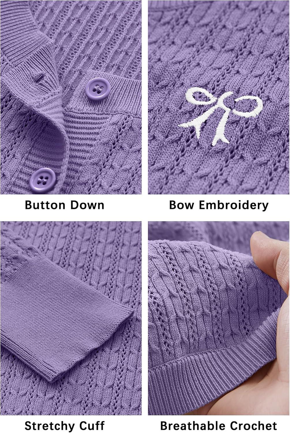 Arach&Cloz Womens 2025 Summer Lightweight Cardigan Long Sleeve Cable Knit Hollow Out Bow Embroidery Tops(Purple)