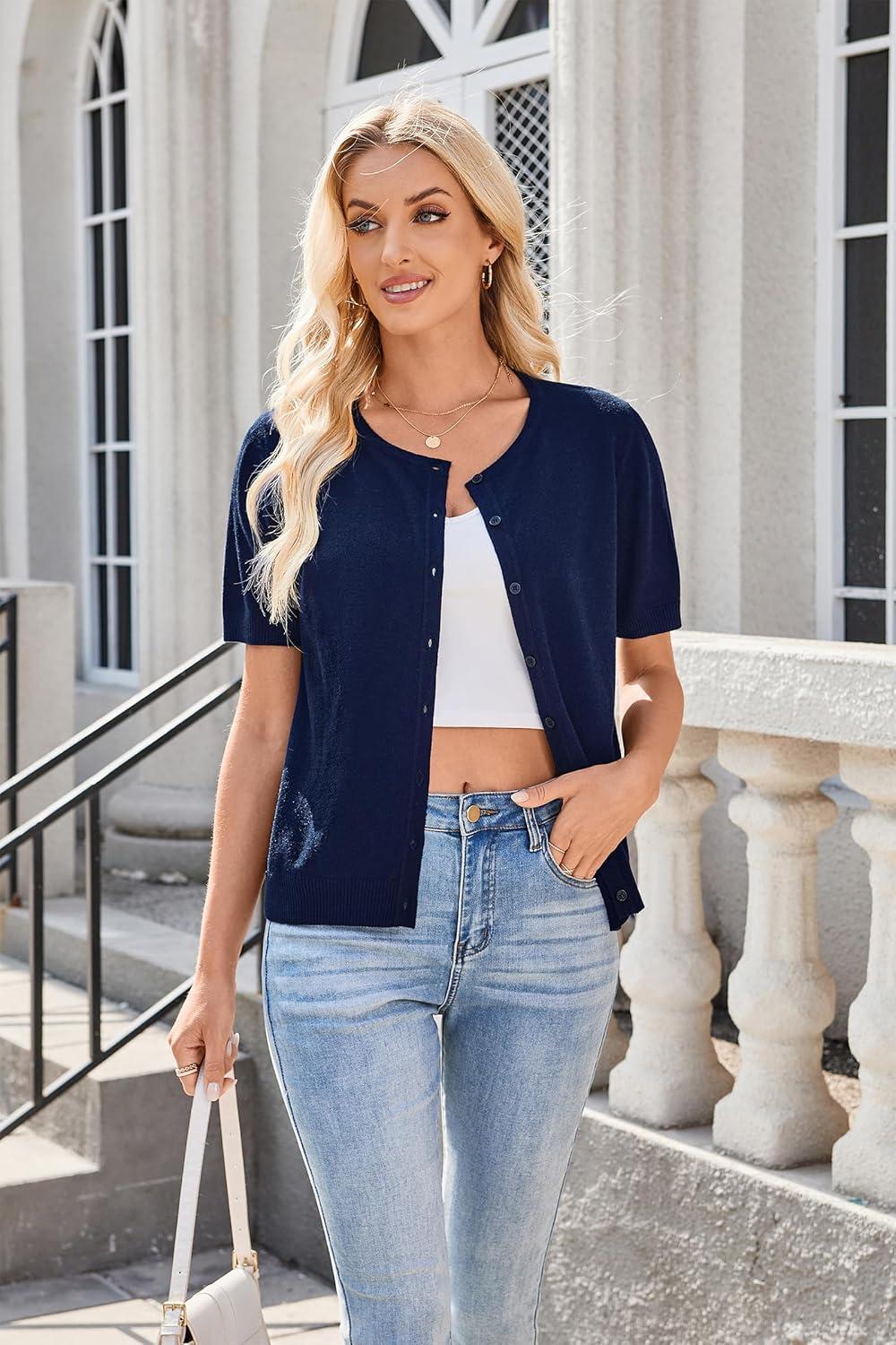 Arach&Cloz Women’s 2025 Summer Lightweight Cropped Cardigan Short Sleeve Crew Neck Bolero Shrug Casual Top(Navy)