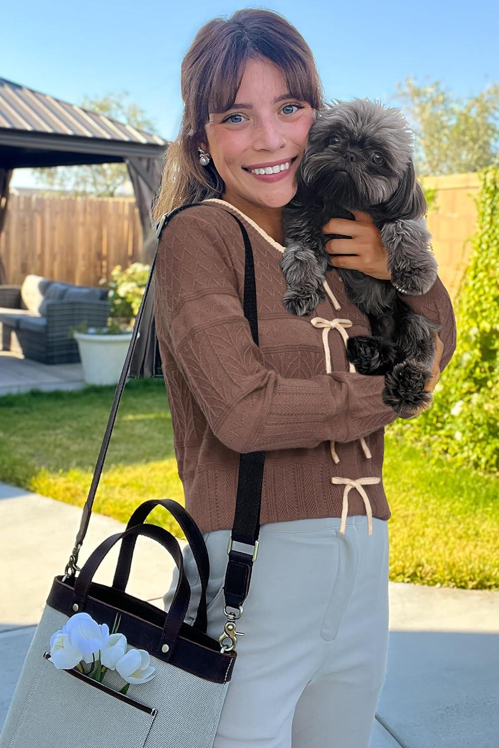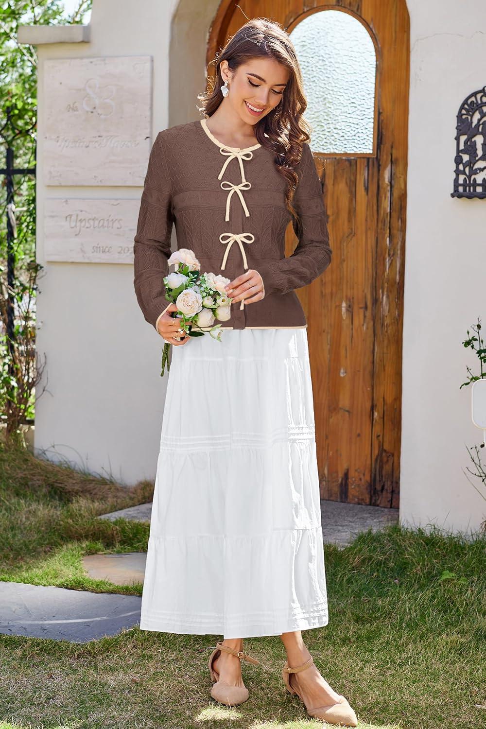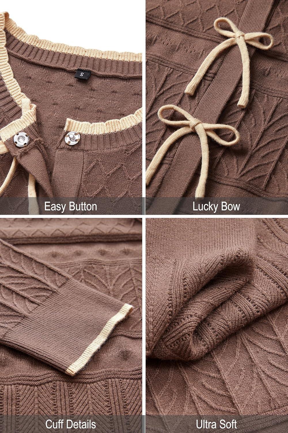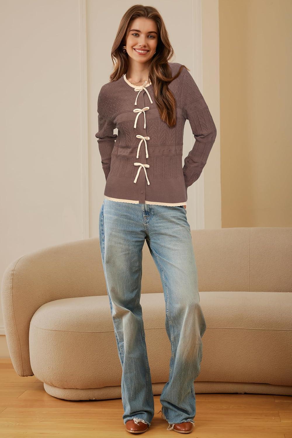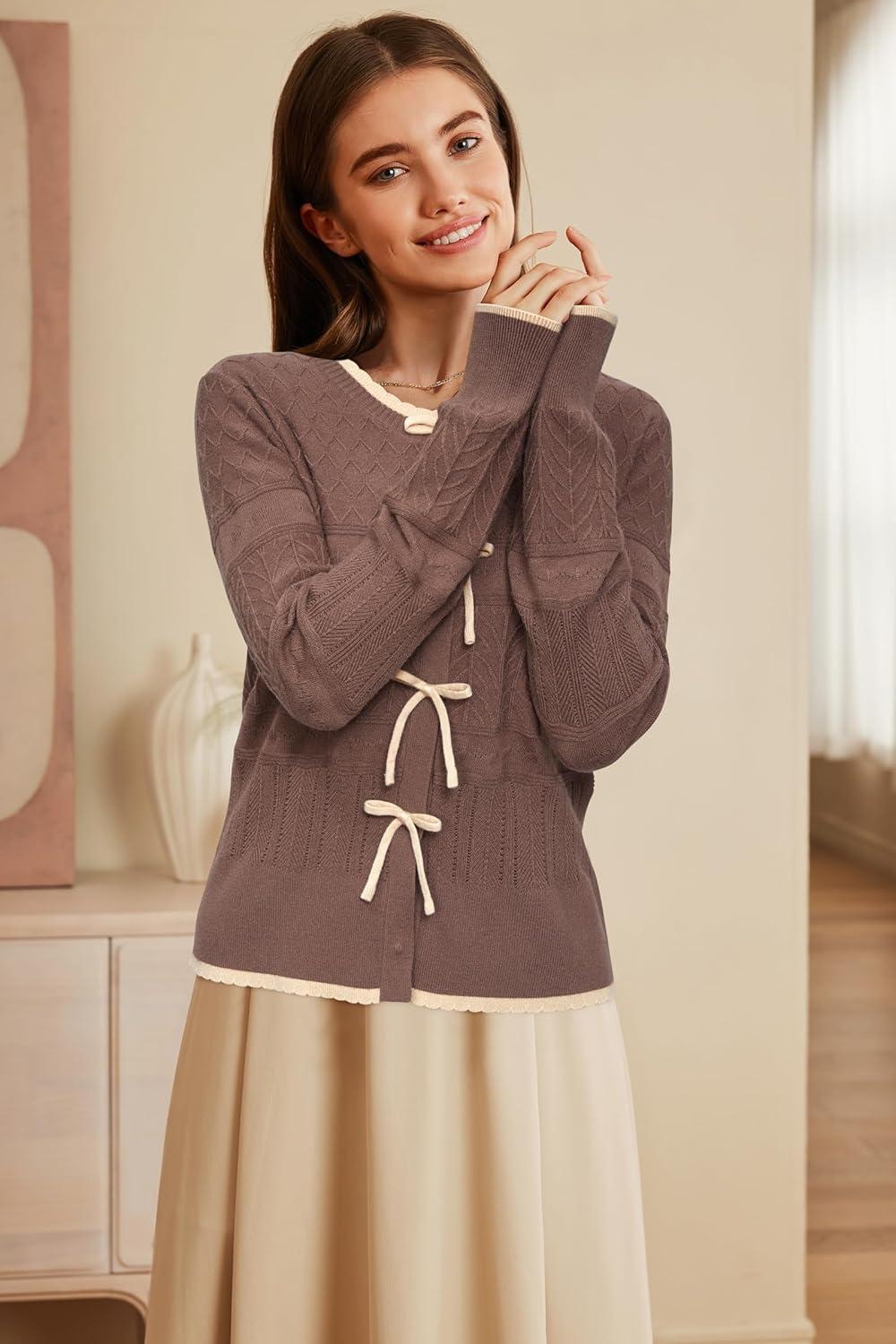 Arach&Cloz Women’s Bow Sweaters Fall Color Block Casual Cardigan Sweaters 2025(Coffee-apricot)