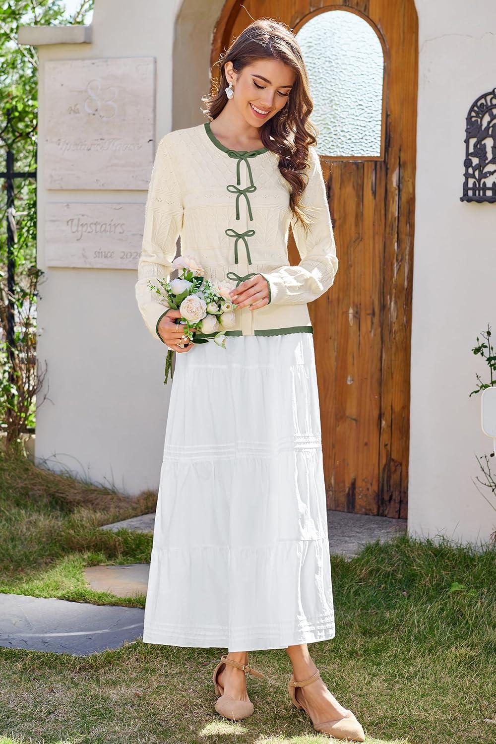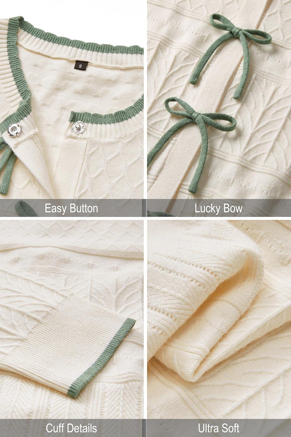 Arach&Cloz Women’s Bow Sweaters Fall Color Block Casual Cardigan Sweaters 2025(Off-white-avocado Green)