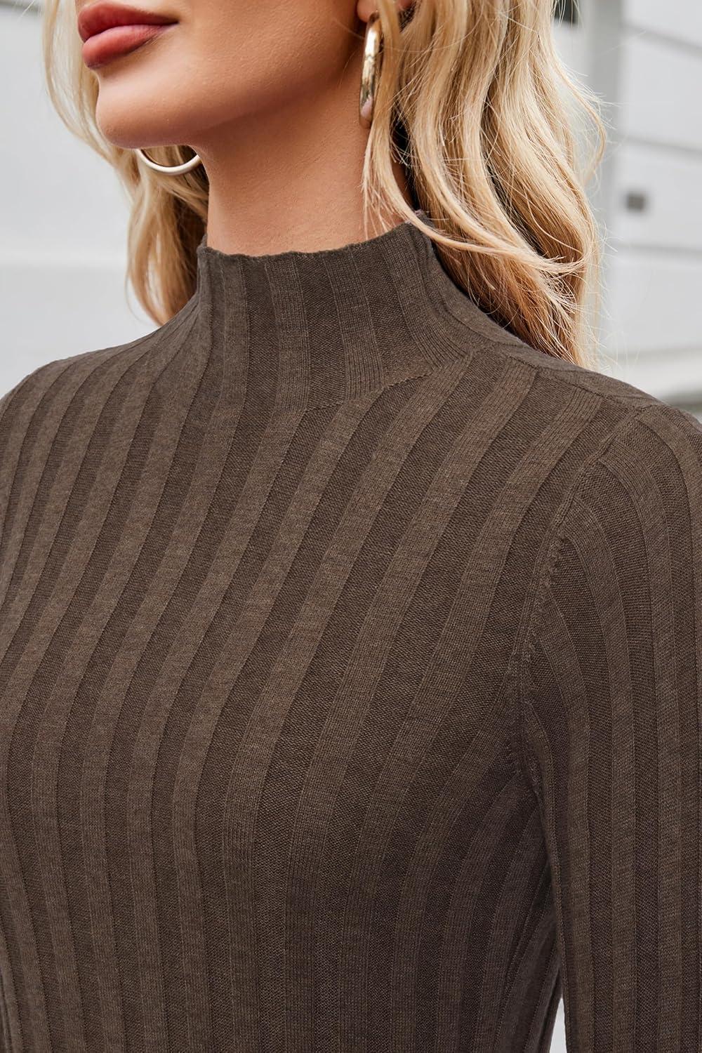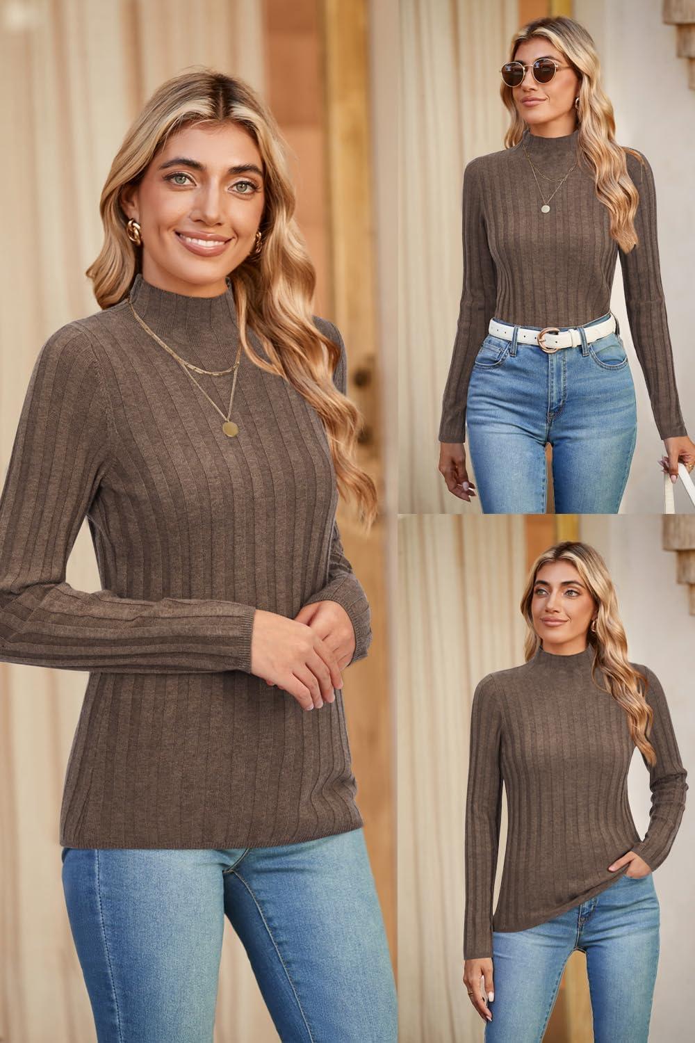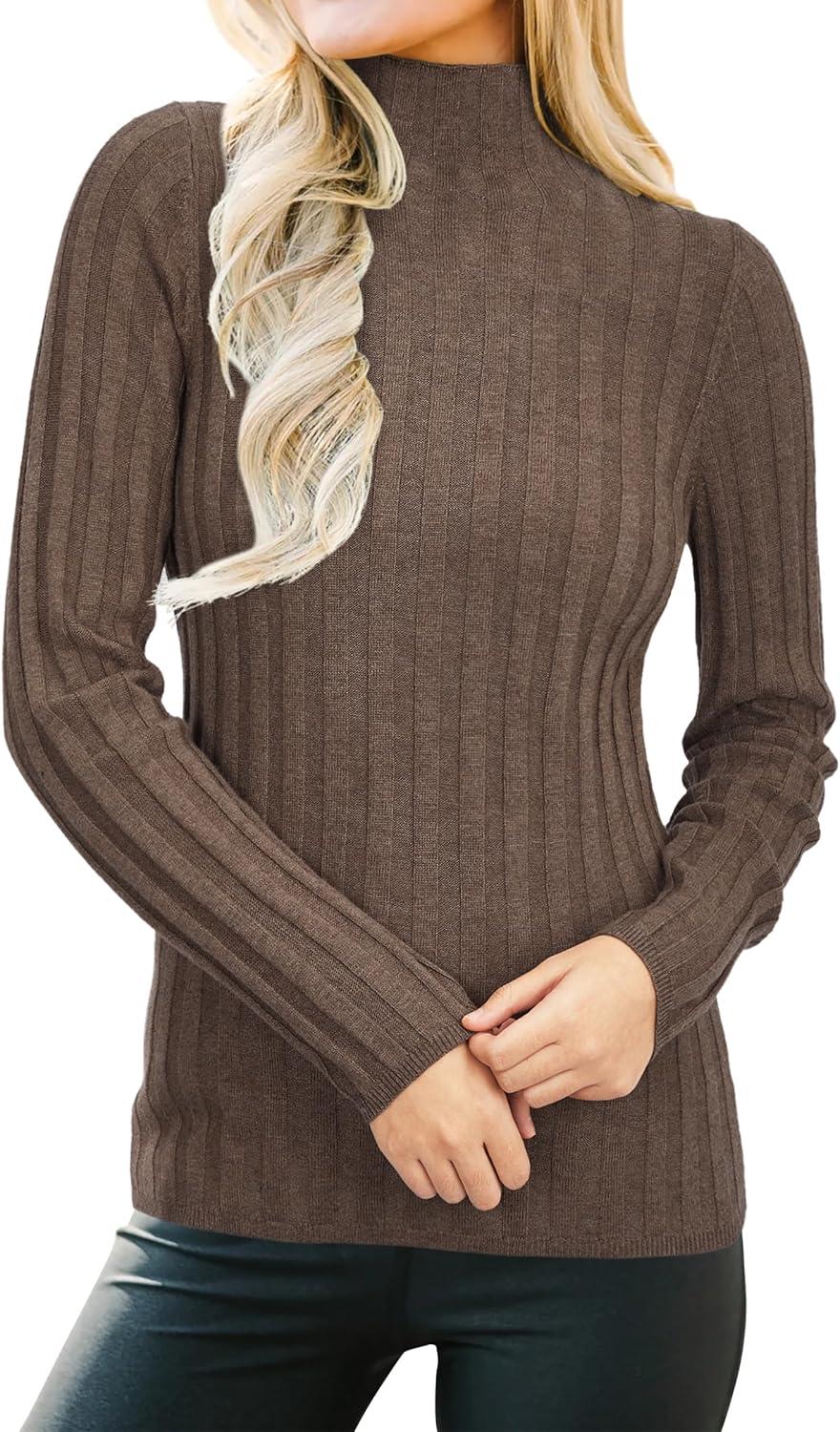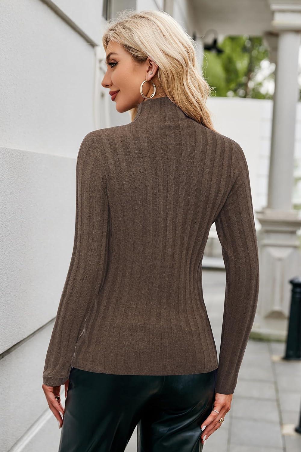 Arach&Cloz Womens Fall Ribbed Wool Blend Sweater Mock Neck Casual Outfits Long Sleeve Fitted Tops Trendy 2024(Brown)