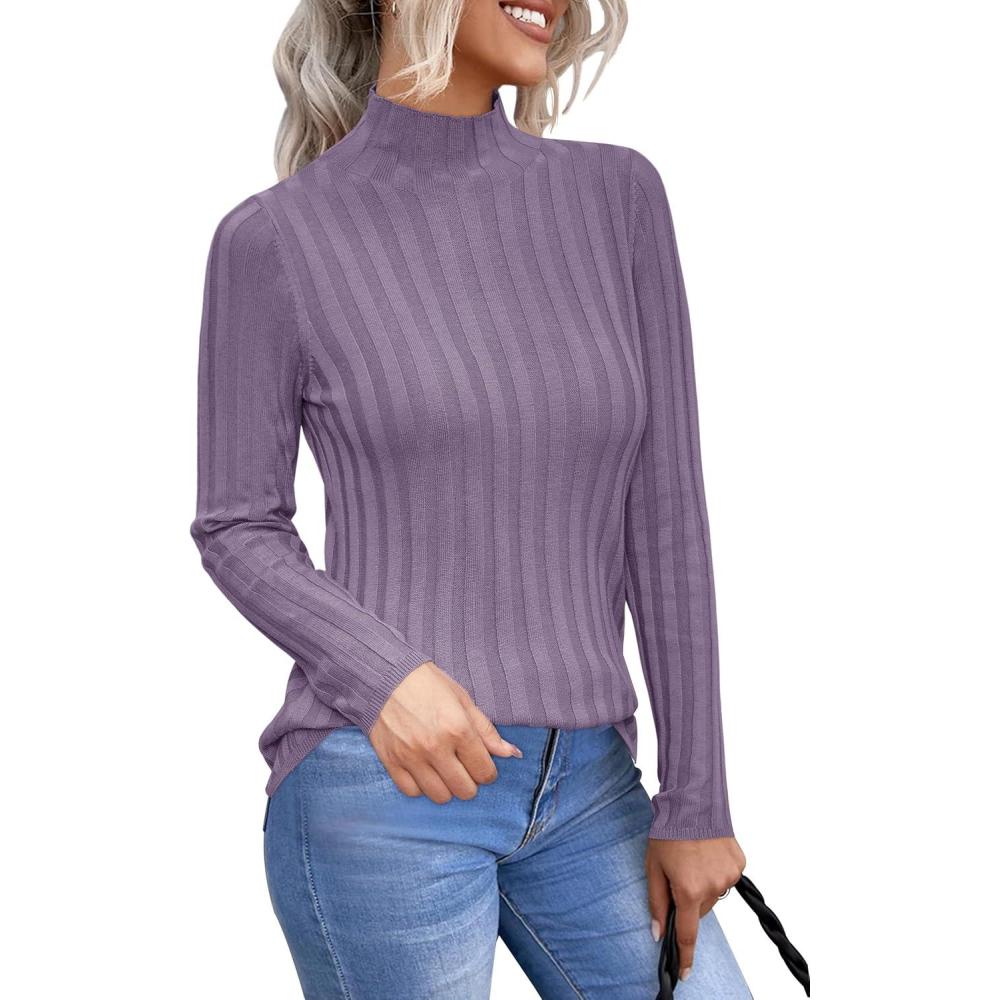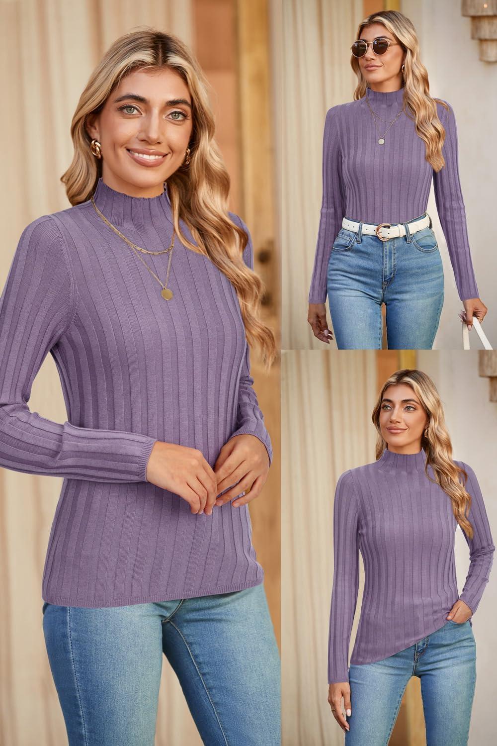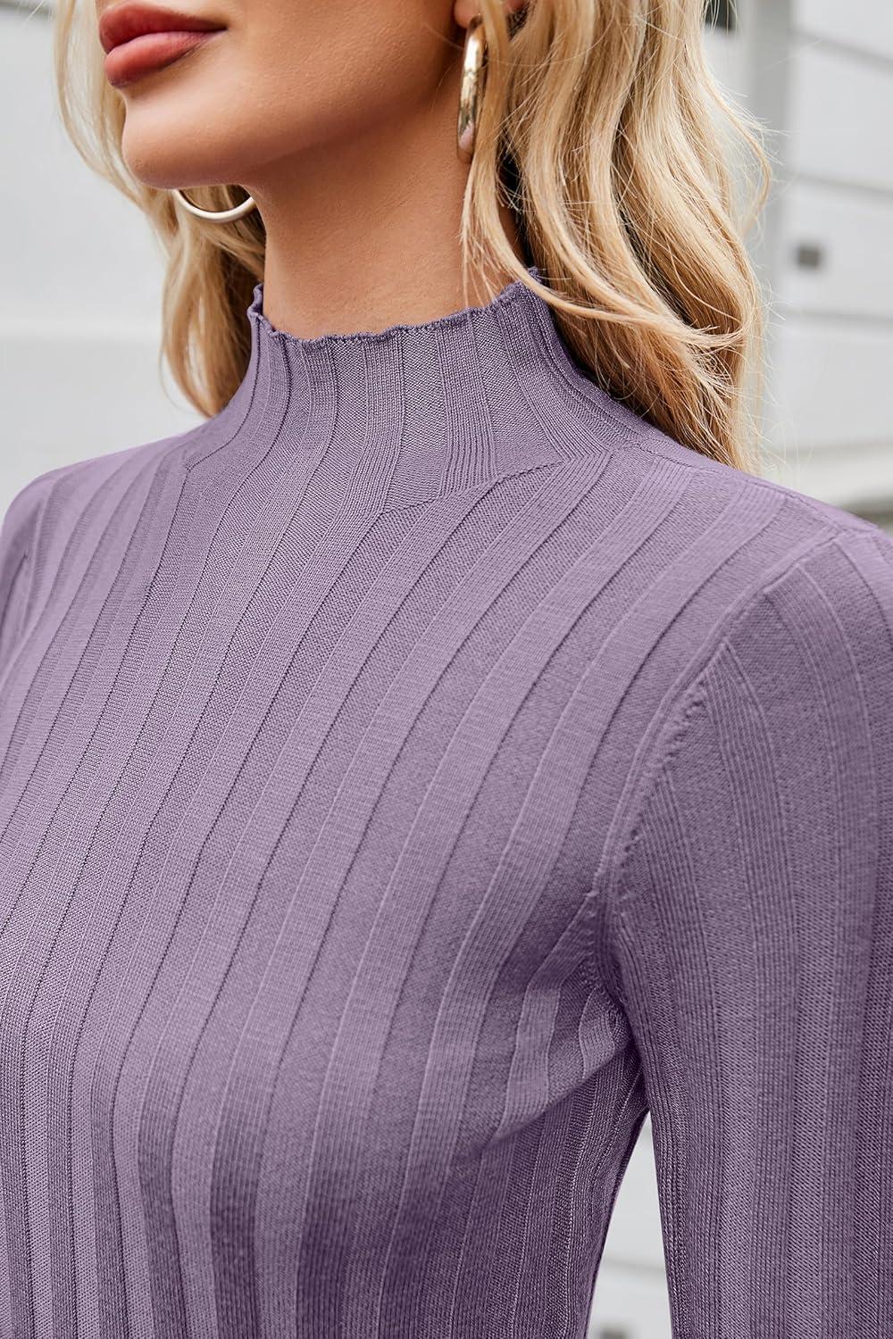 Arach&Cloz Womens Fall Ribbed Wool Blend Sweater Mock Neck Casual Outfits Long Sleeve Fitted Tops Trendy 2024(Grey Purple)
