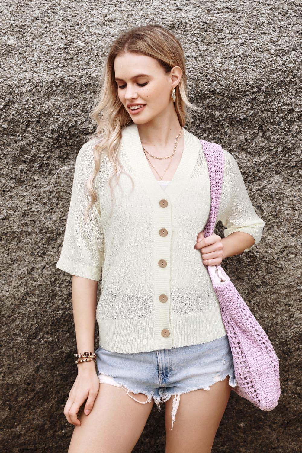 Arach&Cloz Womens Lightweight Cardigan Short Sleeve Shrugs Button Crochet Knit Fashion Sweaters Tops Cozy Clouds Beige