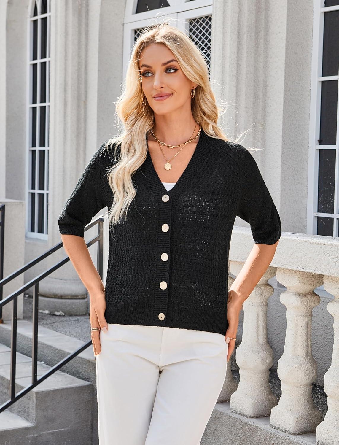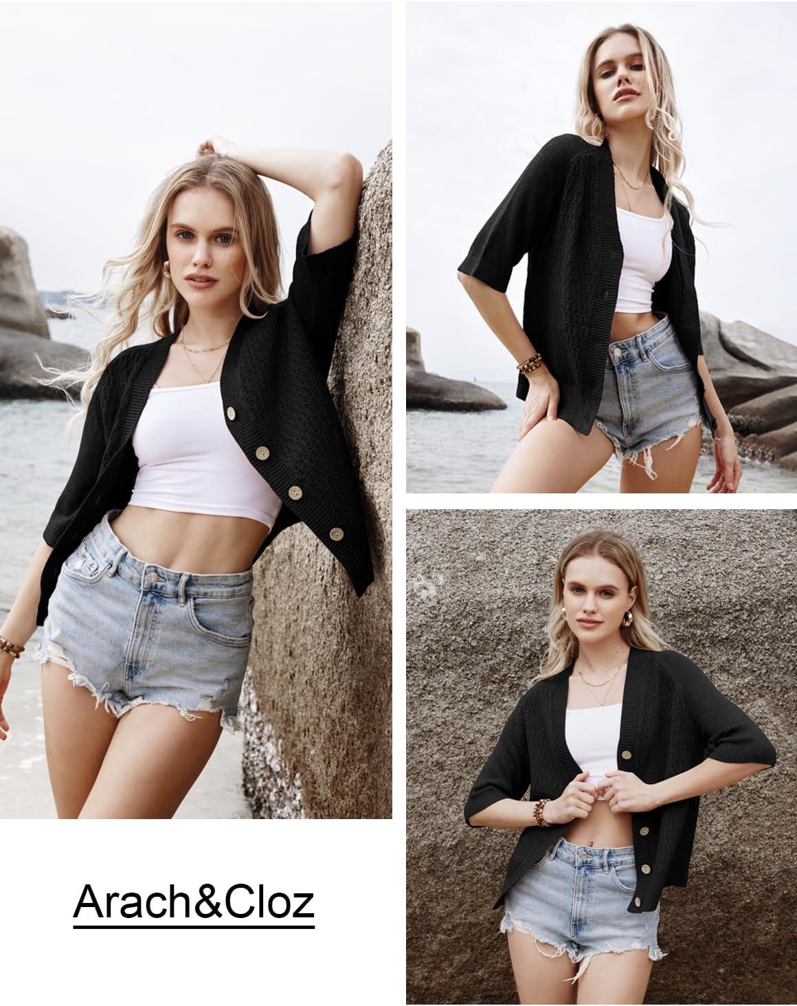 Arach&Cloz Womens Lightweight Cardigan Short Sleeve Shrugs Button Crochet Knit Fashion Sweaters Tops Cozy Clouds(Black)