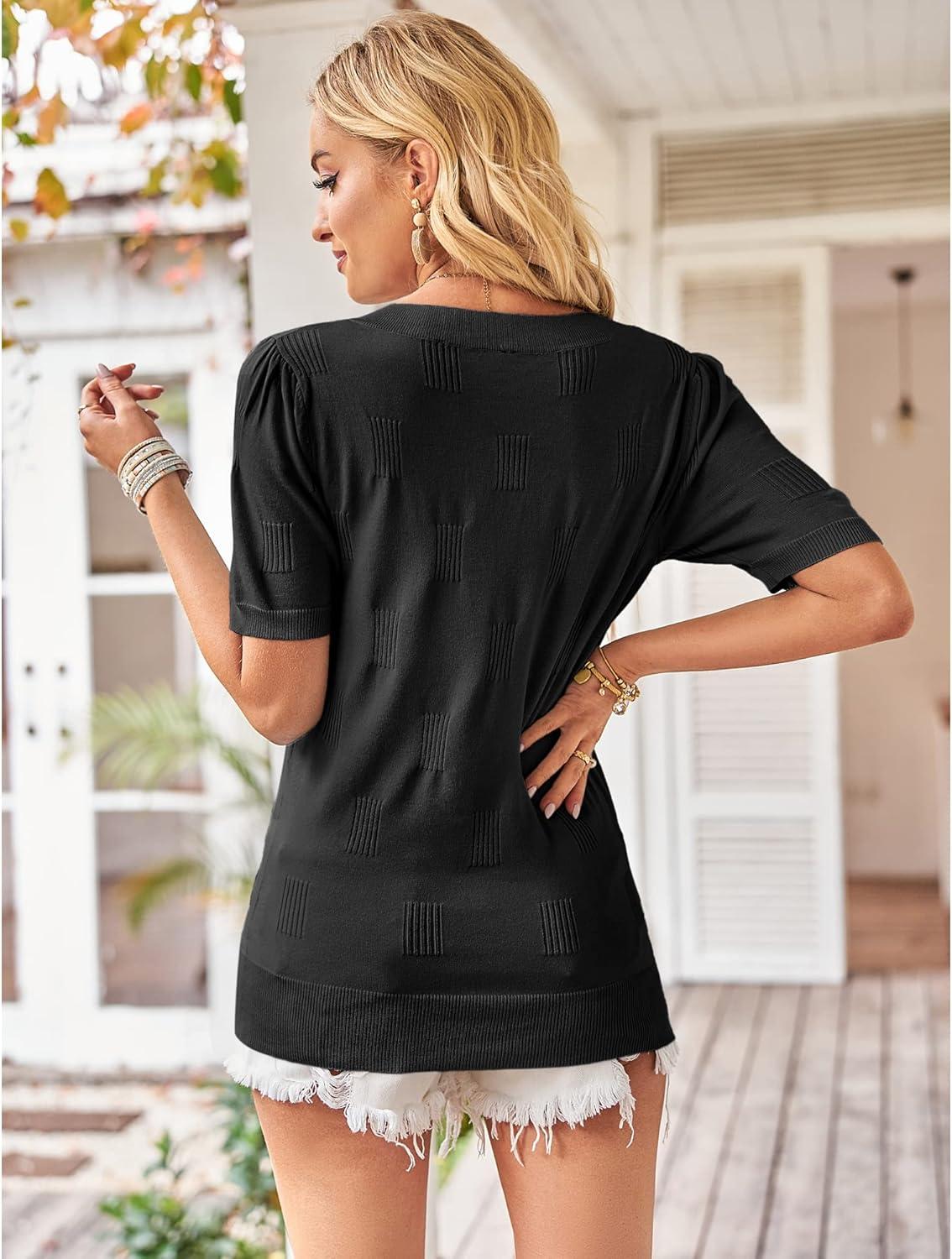 Arach&Cloz Women’s Lightweight Fall Sweater Tops Casual Short Sleeve Blouses Shirts(Az-black)