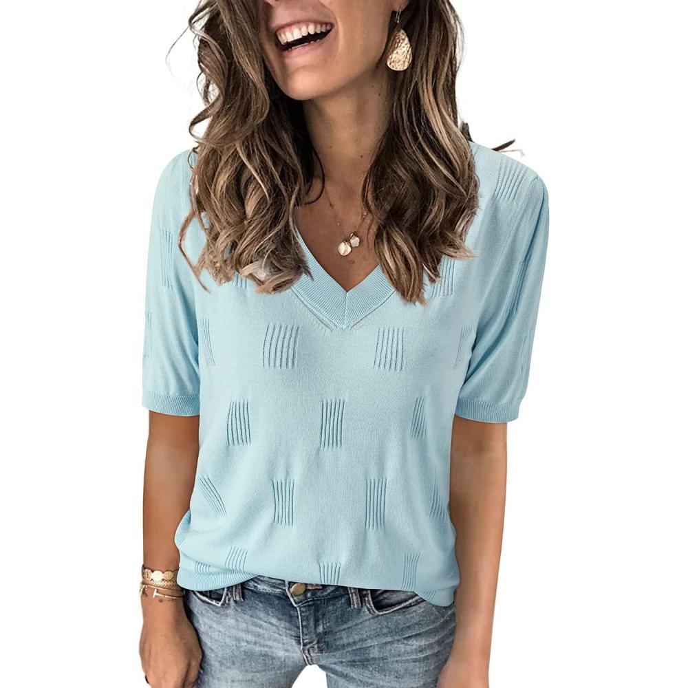 Arach&Cloz Women’s Lightweight Fall Sweater Tops Casual Short Sleeve Blouses Shirts(Az-light Blue)
