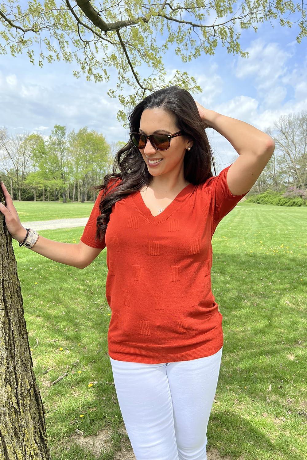 Arach&Cloz Women’s Lightweight Fall Sweater Tops Casual Short Sleeve Blouses Shirts(Az-rust)