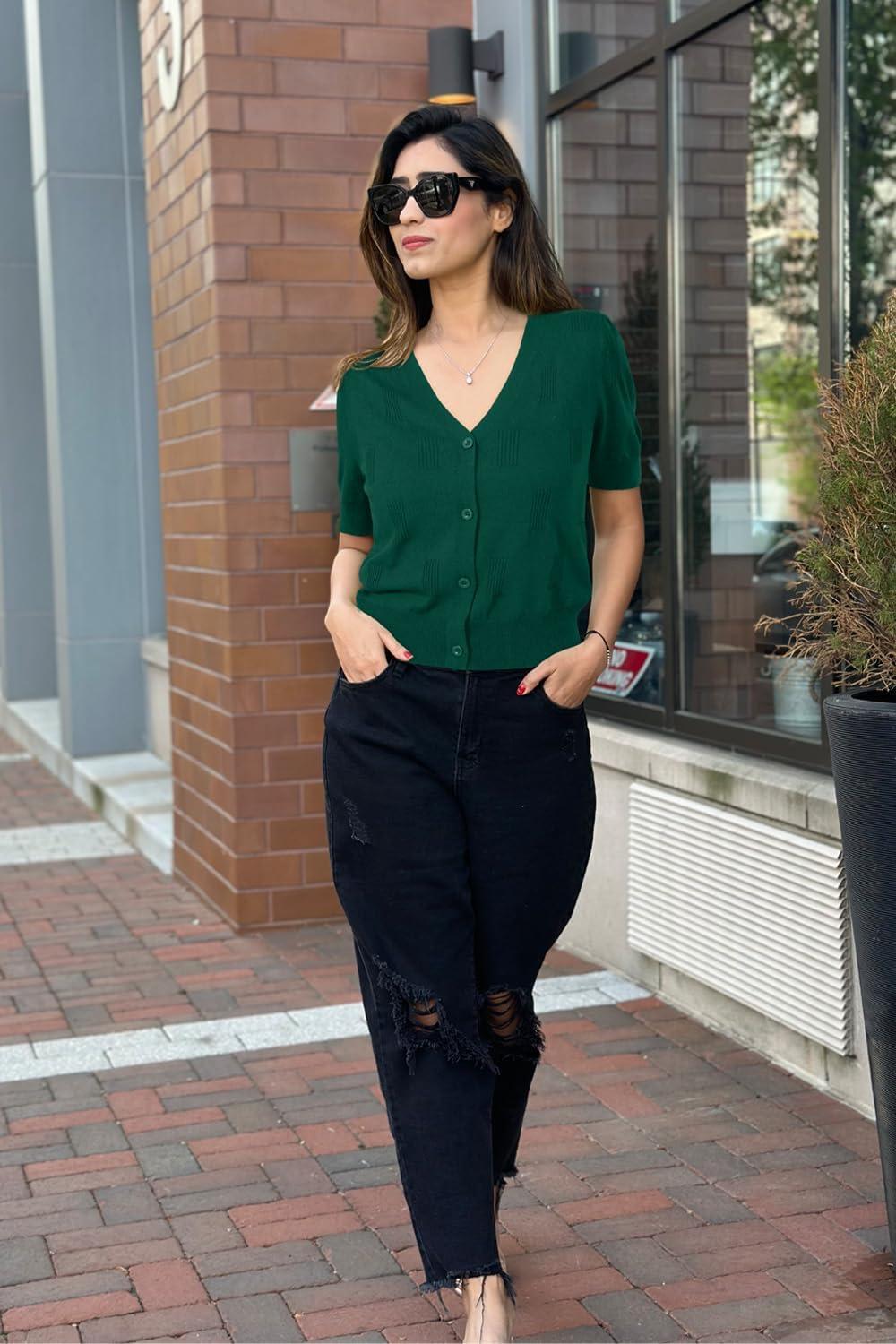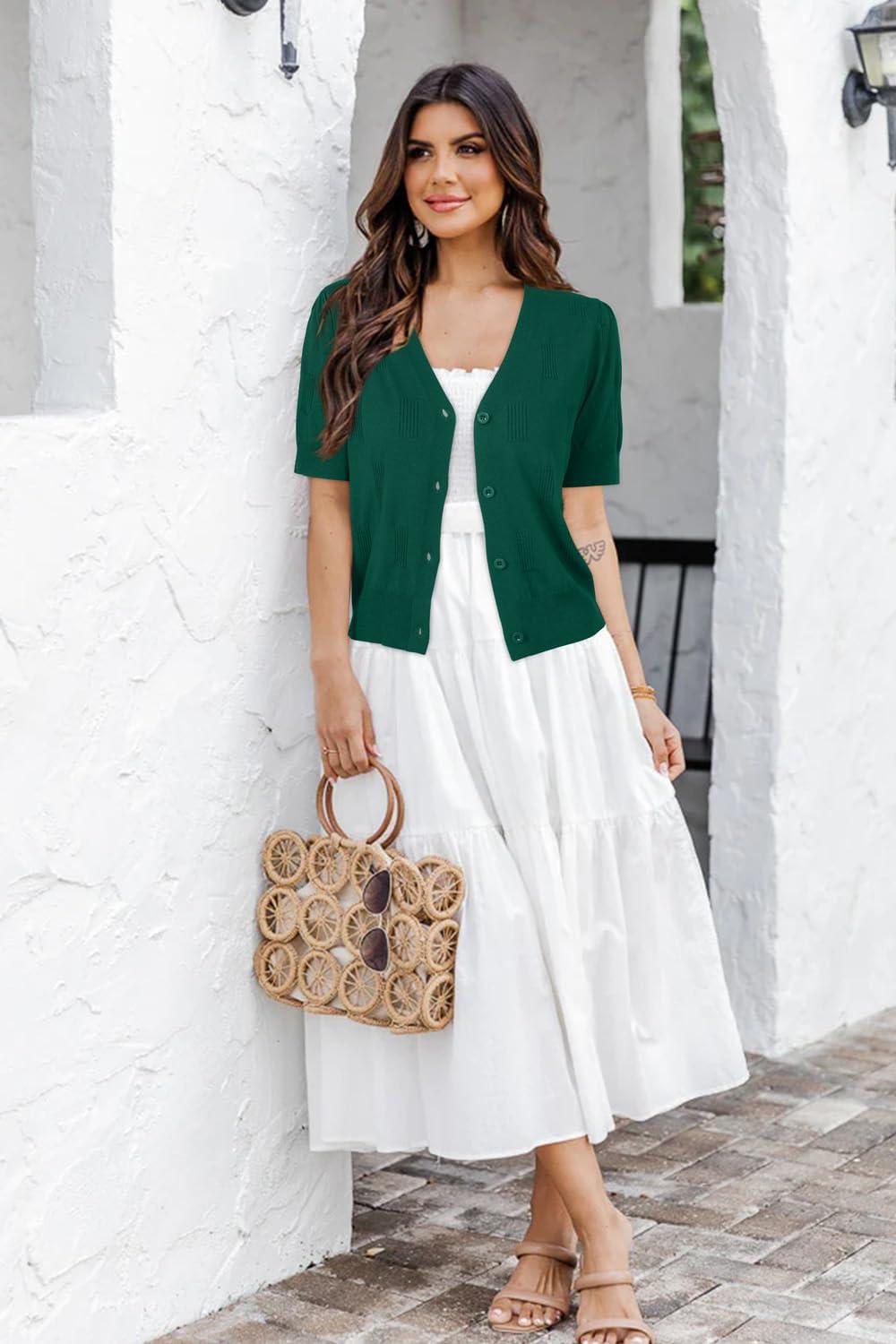 Arach&Cloz Women’s Lightweight Summer Business Casual Cropped Short Sleeve Cardigan(Dark Green)