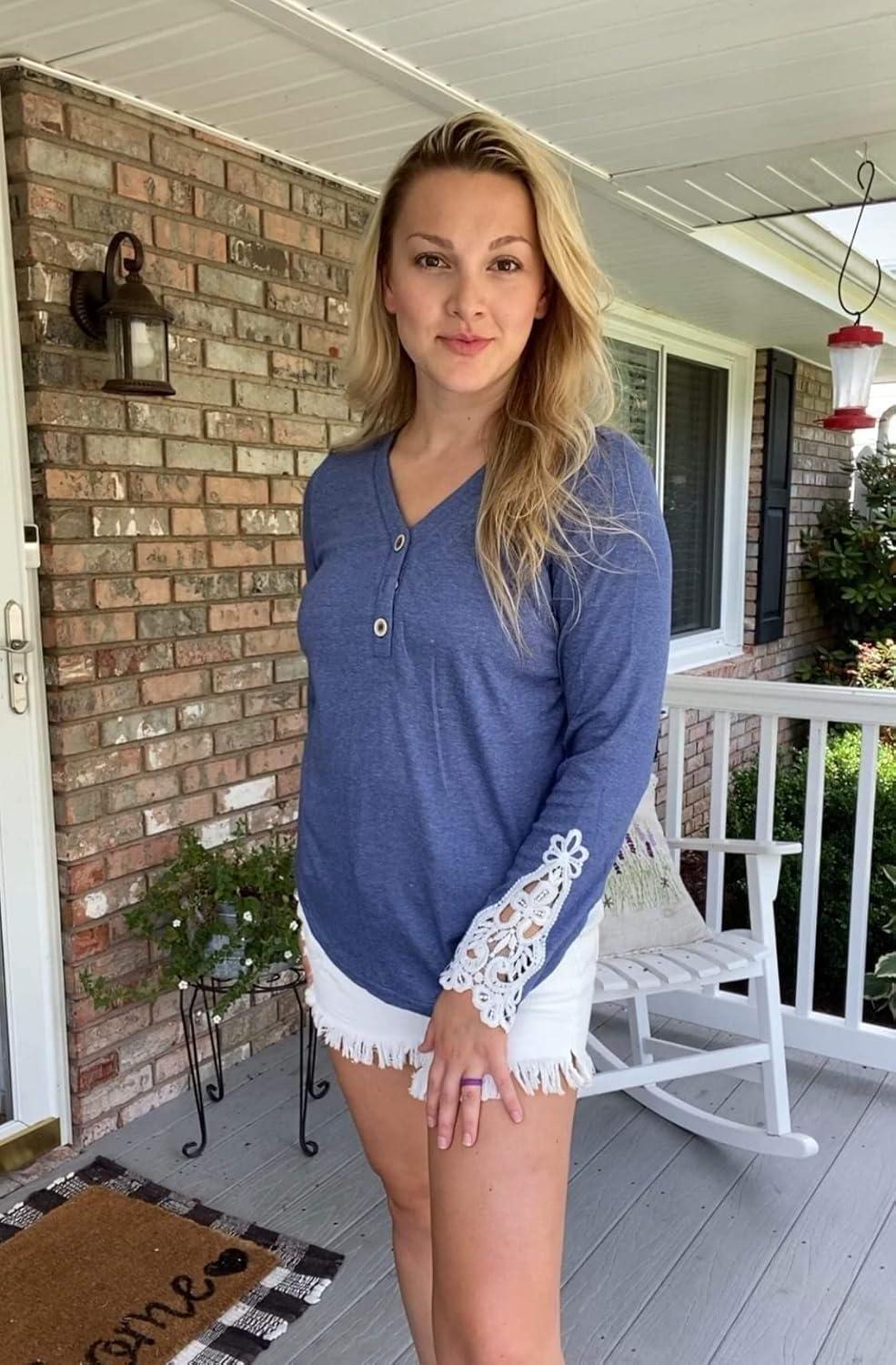 Arach&Cloz Womens Long Sleeve Lace Fall Tops Solid V Neck Button Henley Shirt Casual Tunic Blouse(Blue)