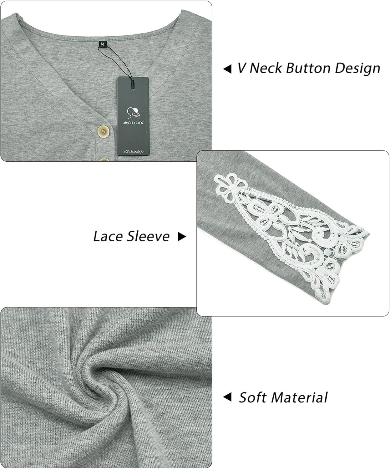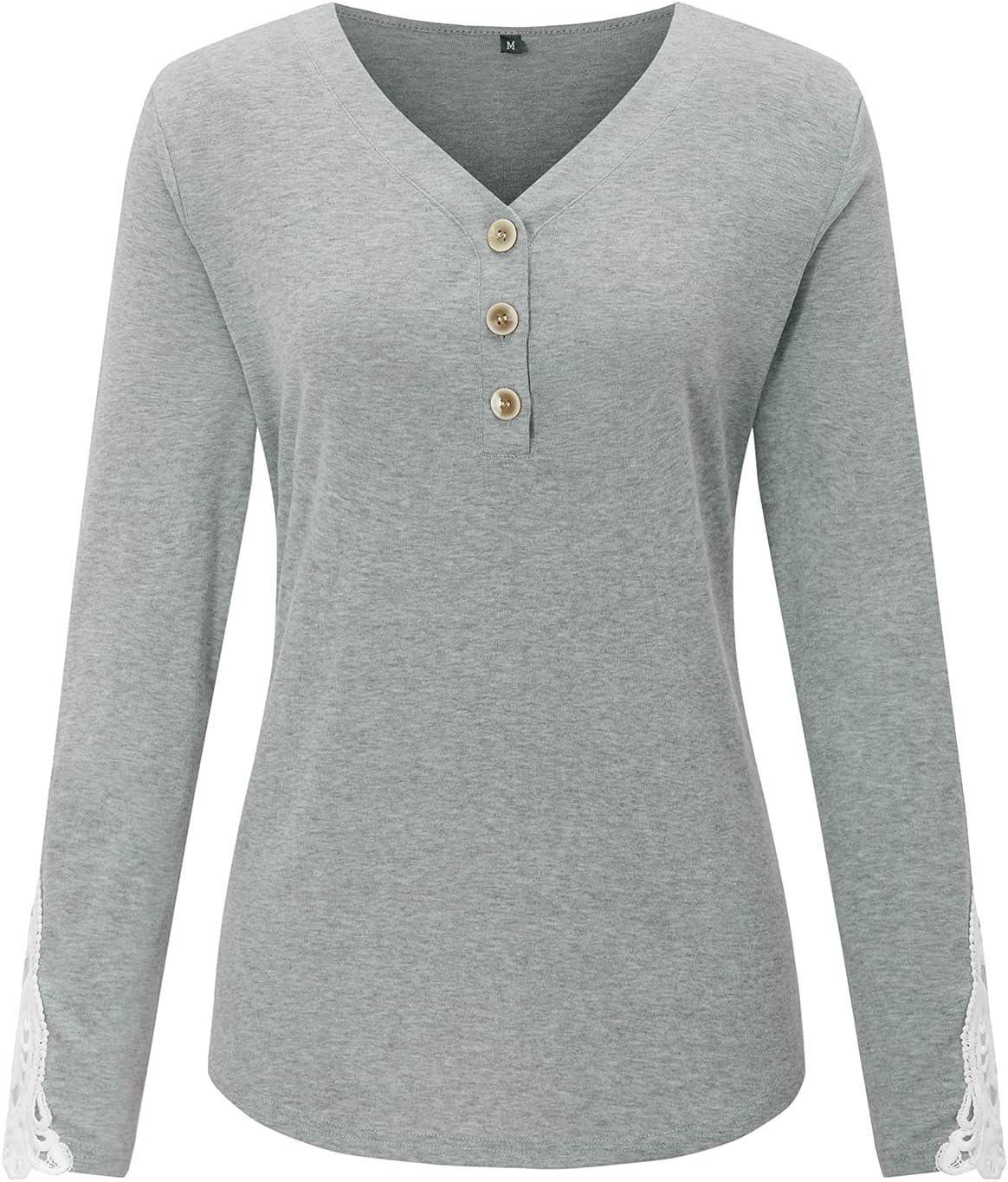 Arach&Cloz Womens Long Sleeve Lace Fall Tops Solid V Neck Button Henley Shirt Casual Tunic Blouse(Light Gray)