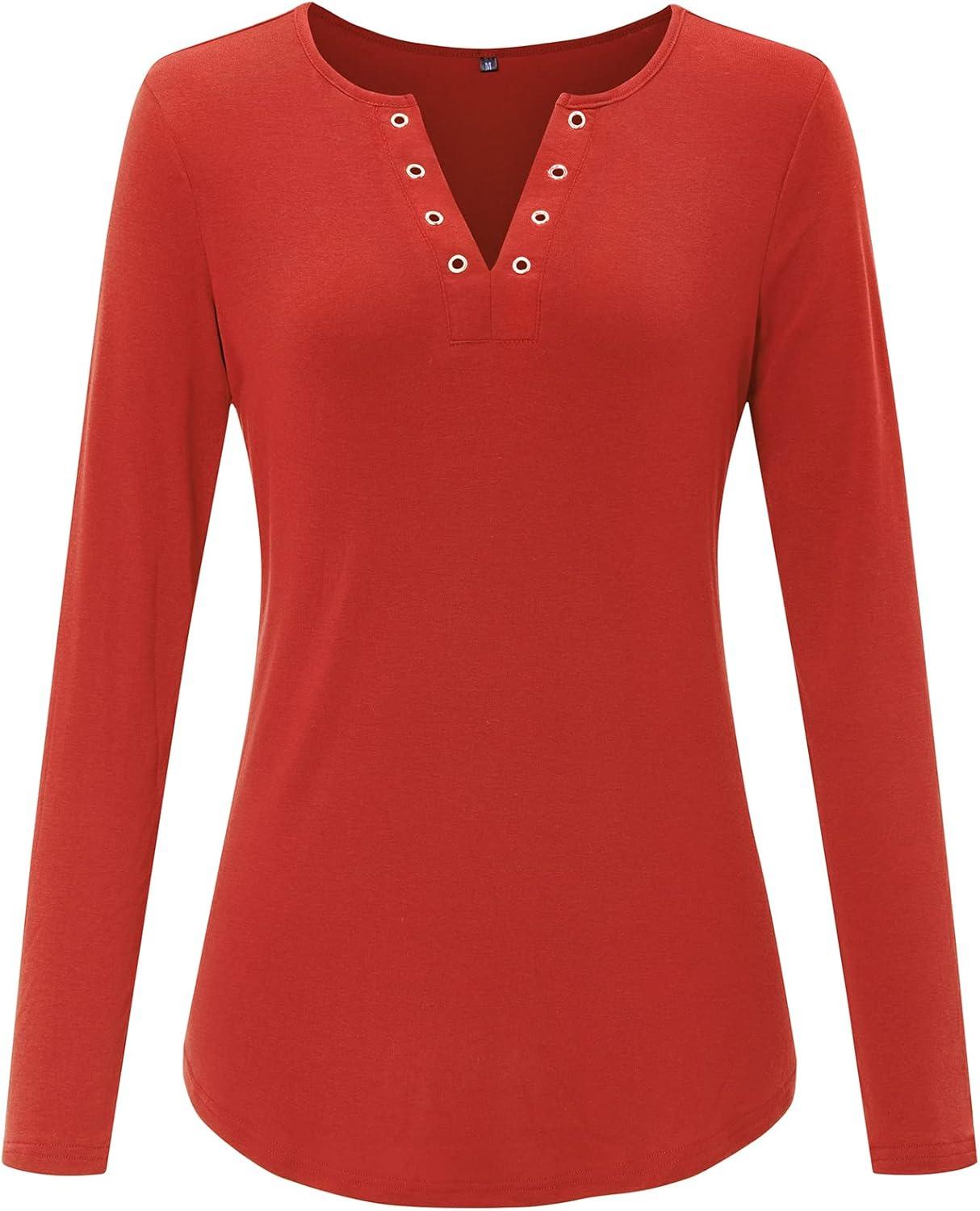 Arach&Cloz Womens Long Sleeve Lace Fall Tops Solid V Neck Button Henley Shirt Casual Tunic Blouse(Red02)