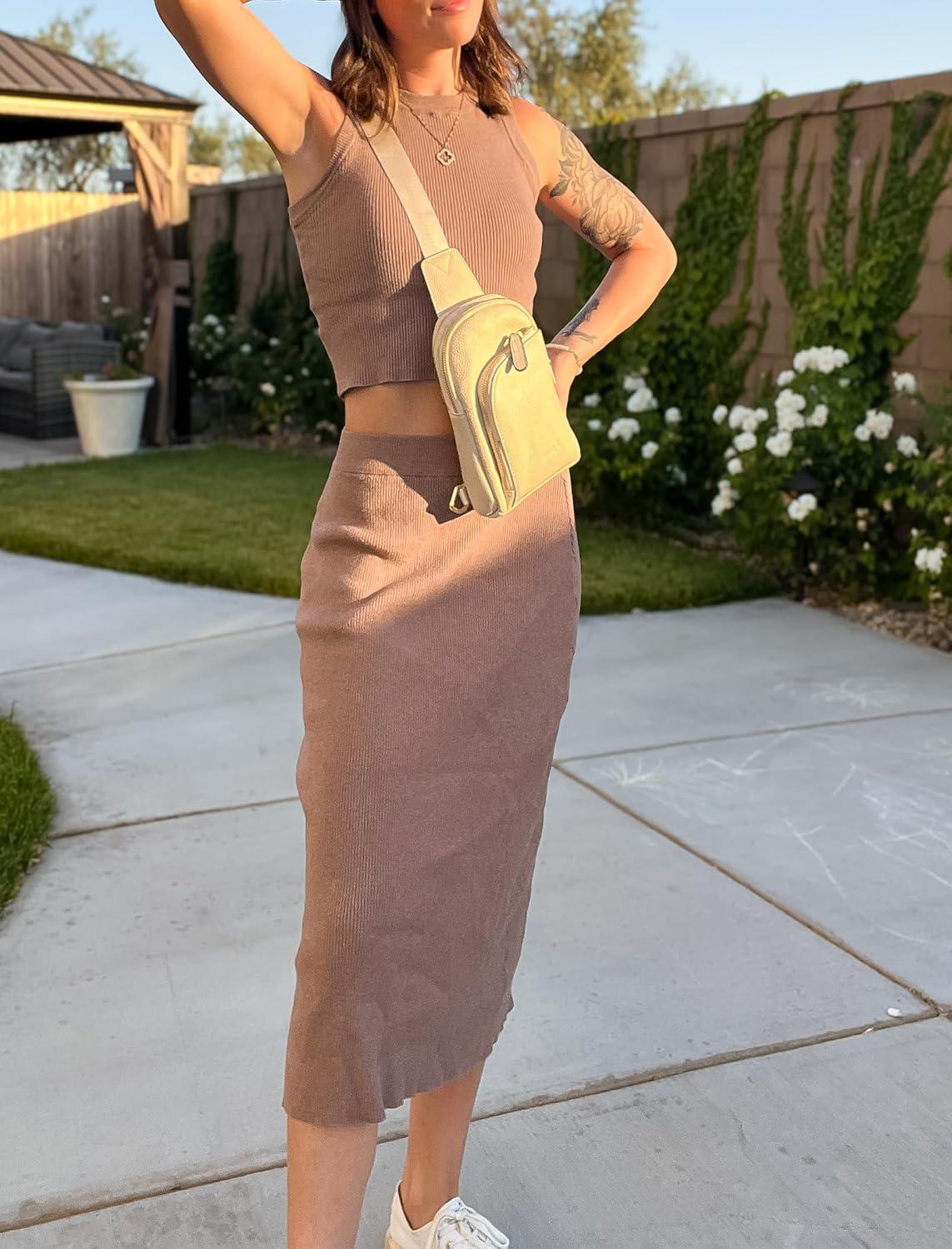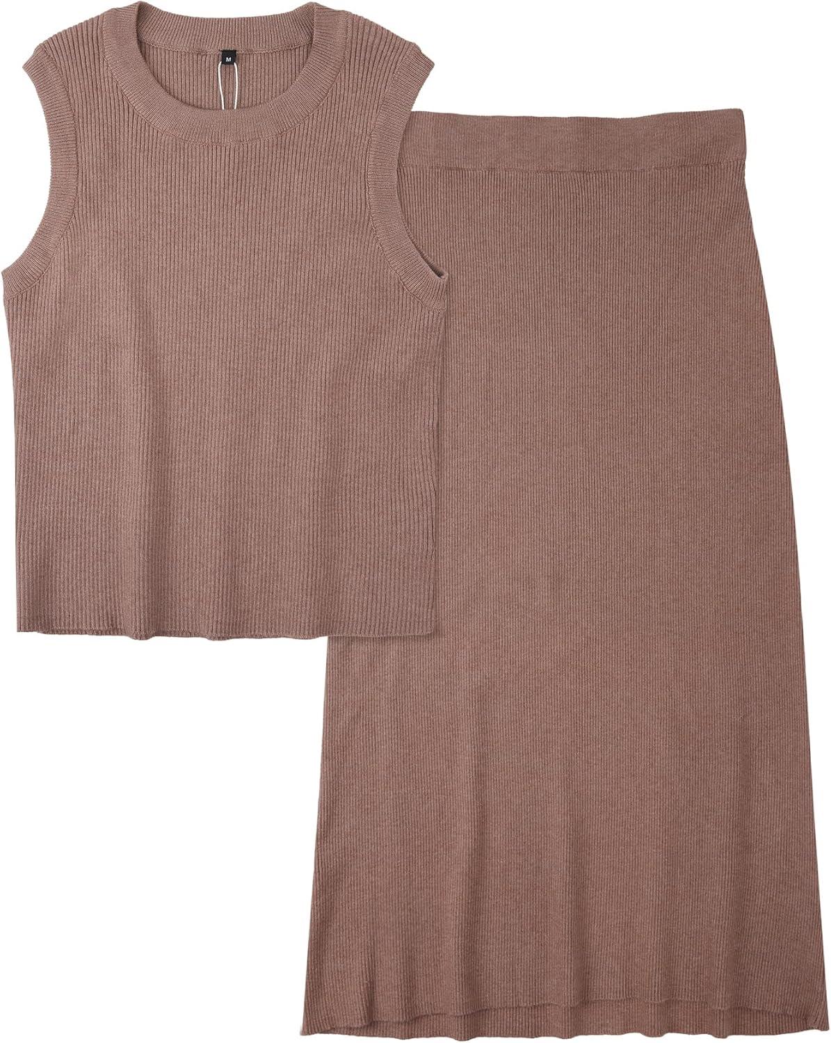 Arach&Cloz Women’s Non See Through 2 Piece Sets Early Fall Tank Top and Midi Skirt Knit Outfits(Coffee)