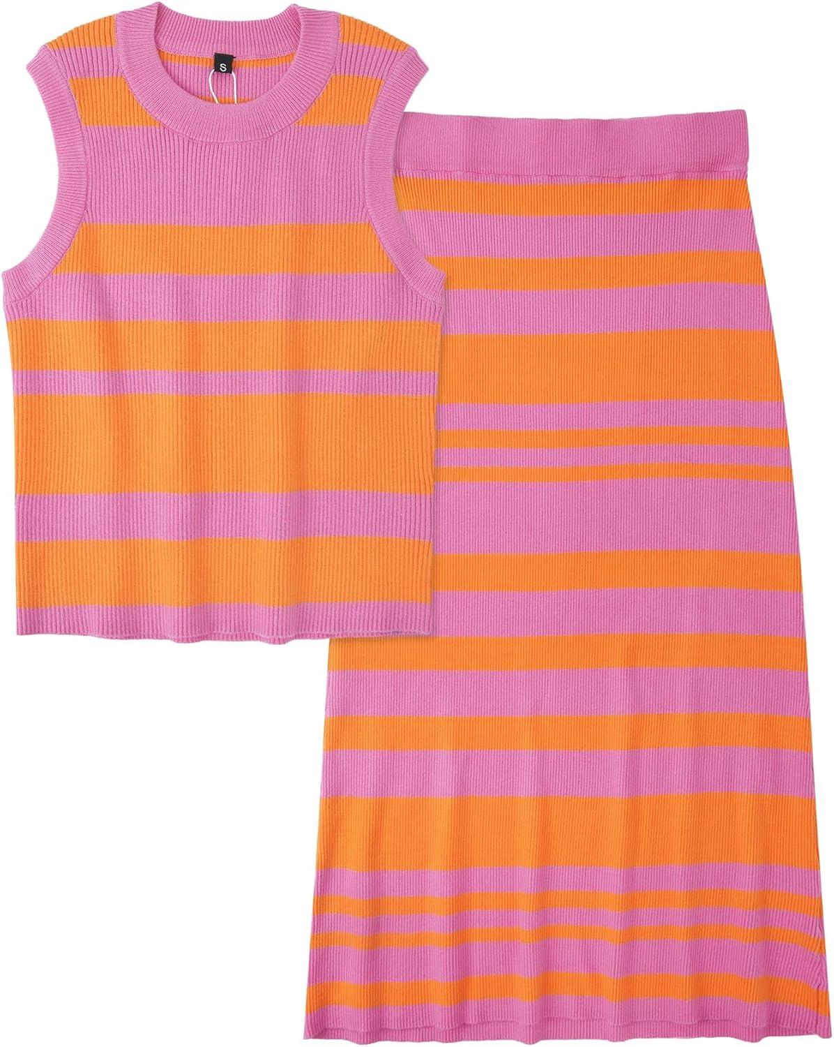 Arach&Cloz Women’s Non See Through 2 Piece Sets Early Fall Tank Top and Midi Skirt Knit Outfits(Dark Orange Pink)