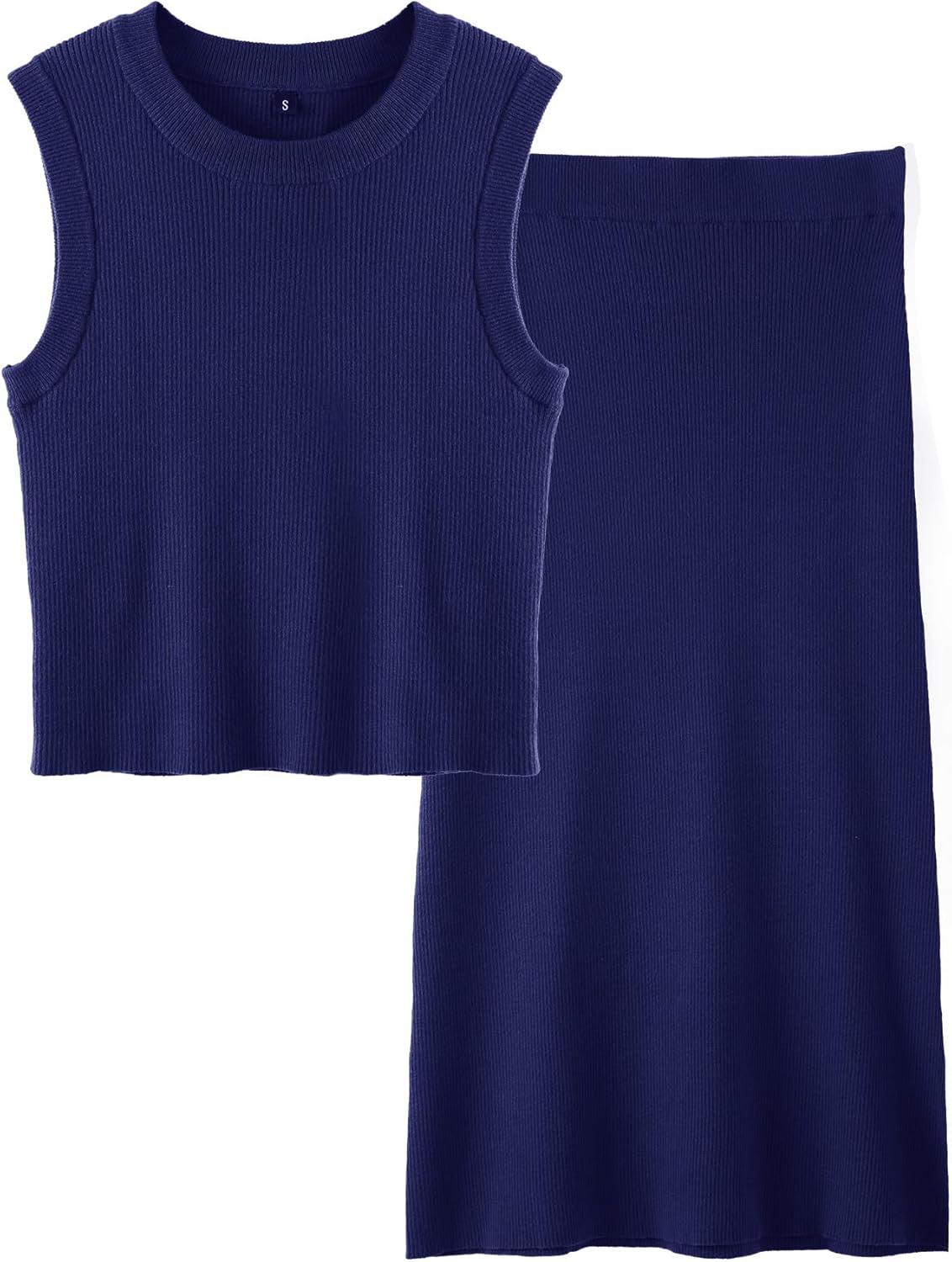 Arach&Cloz Women’s Non See Through 2 Piece Sets Early Fall Tank Top and Midi Skirt Knit Outfits(Navy)