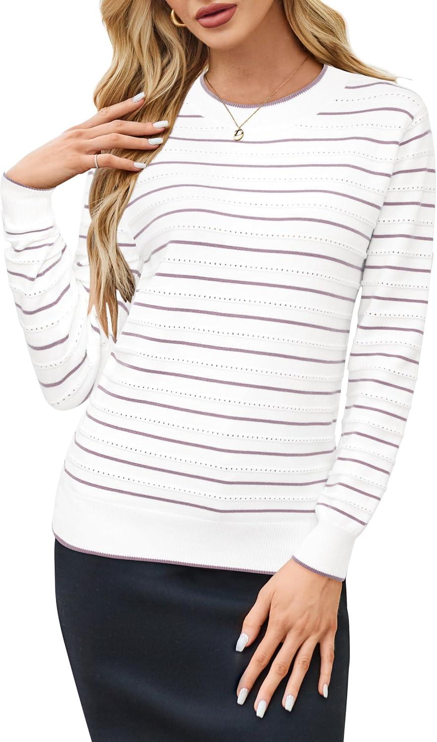 Arach&Cloz Women’s Soft Knit Sweater Fall Dressy Casual Pullover Tops(Striped White Purple)