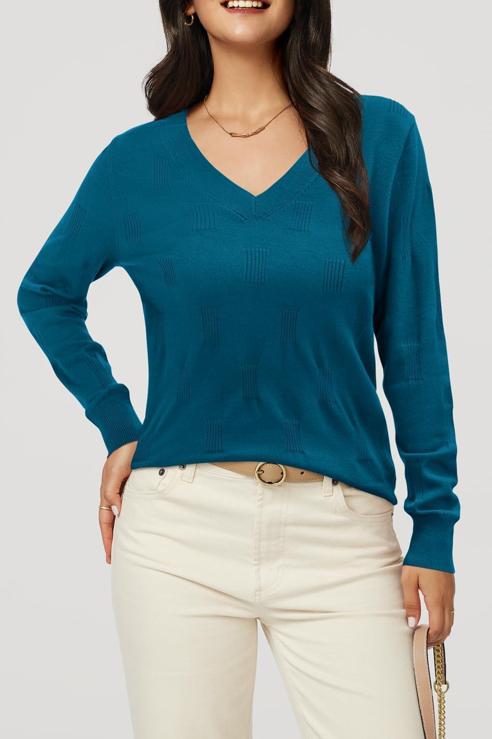 Arach&Cloz Women’s Soft V Neck Long Sleeve Fall Casual Regular Fit Sweater Tops(Peacock Blue)