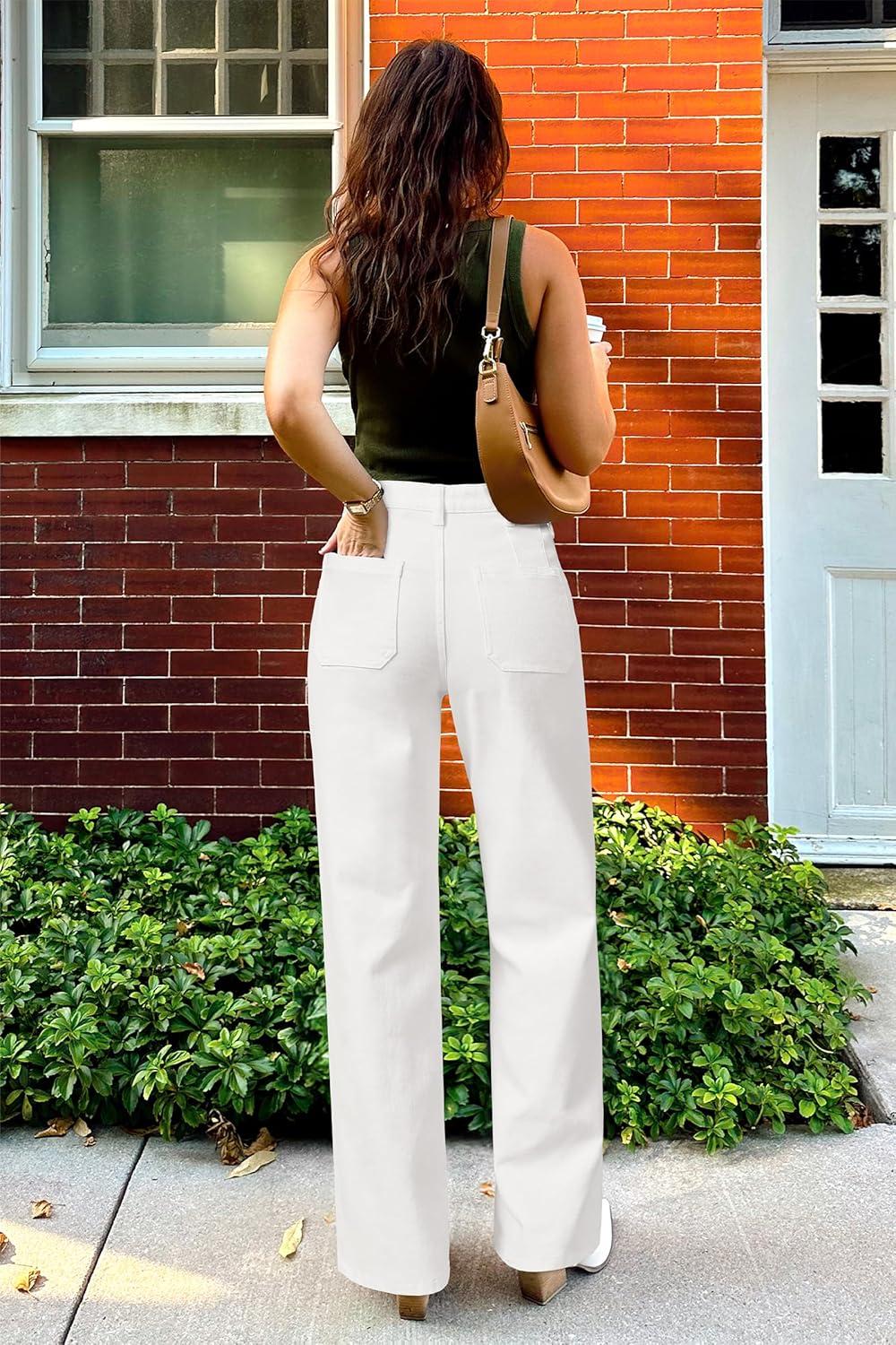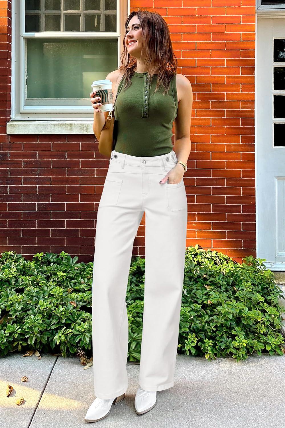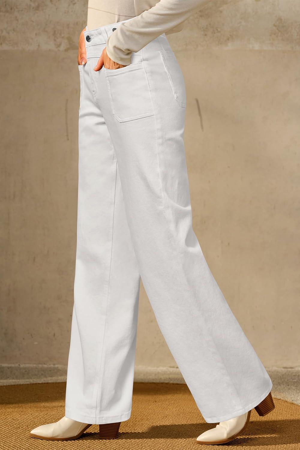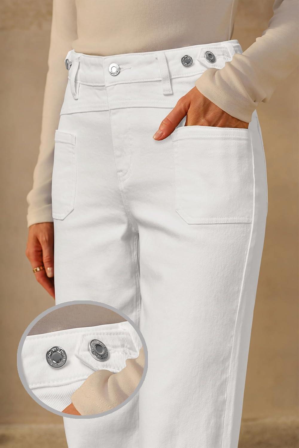 Arach&Cloz Women’s Stretchy Denim Adjustable Waist Buttons High Waisted Wide Leg Jeans 2025(White)
