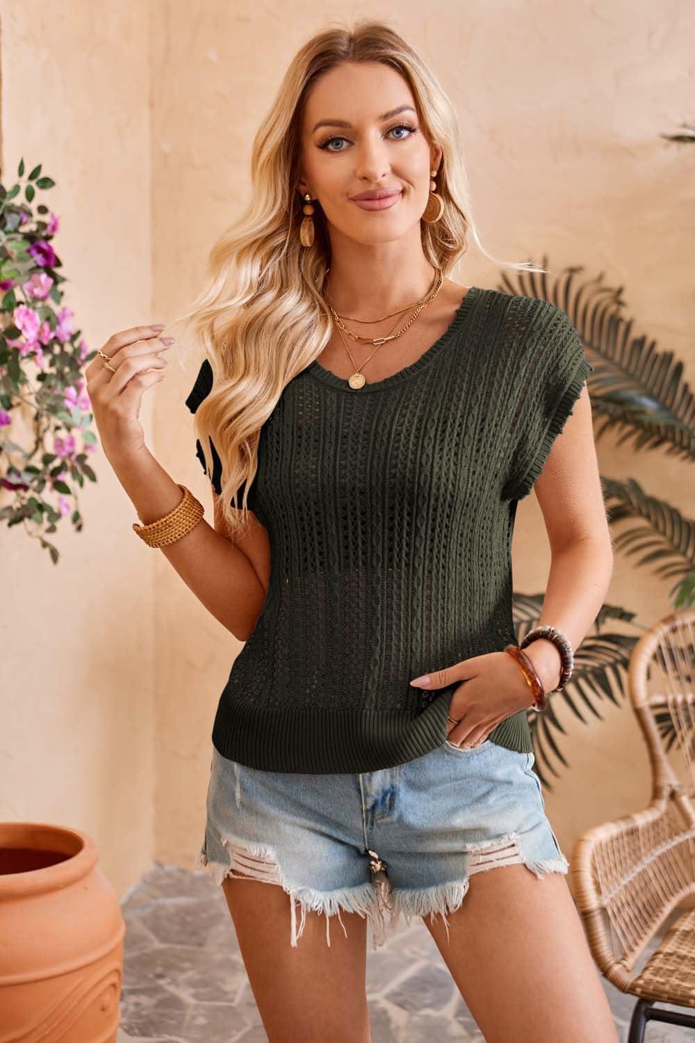 Arach&Cloz Womens Summer Crochet Tops 2024 Lightweight Cap Sleeve Crew Neck Knit Fashion Casual Sleeveless Sweater Vest(Army Green)