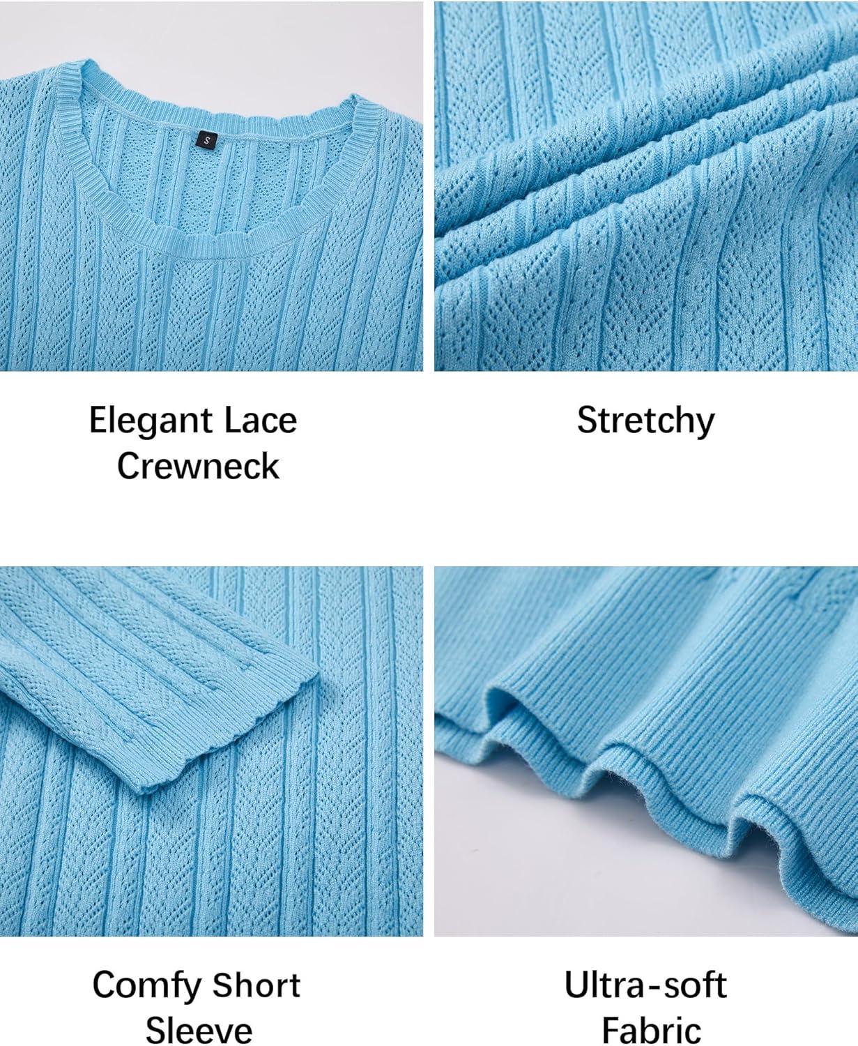 Arach&Cloz Women’s Summer Fall Scalloped Lace Cuff Crewneck Tops Textured Shirts(Cool Blue)