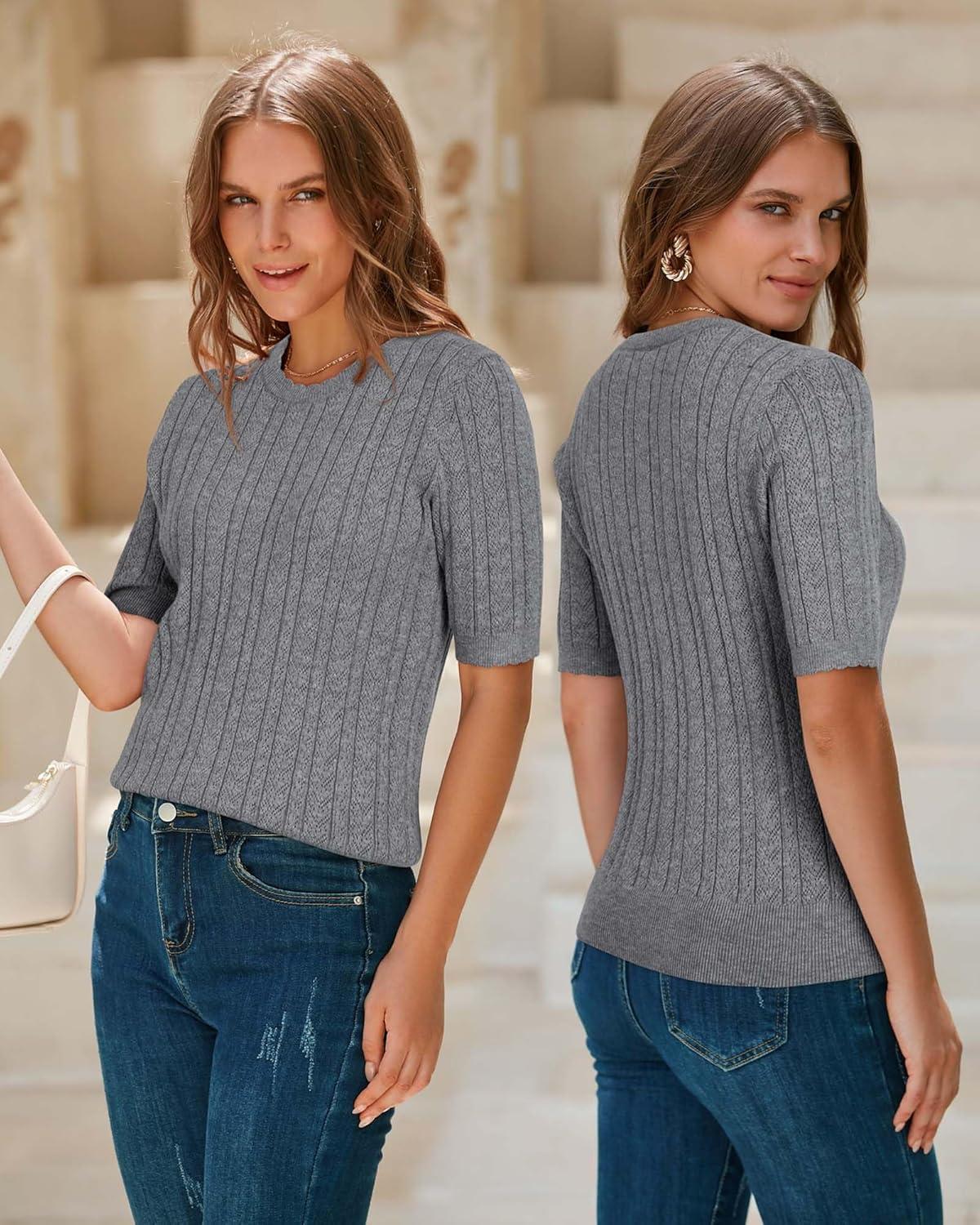 Arach&Cloz Women’s Summer Fall Scalloped Lace Cuff Crewneck Tops Textured Shirts(Grey)