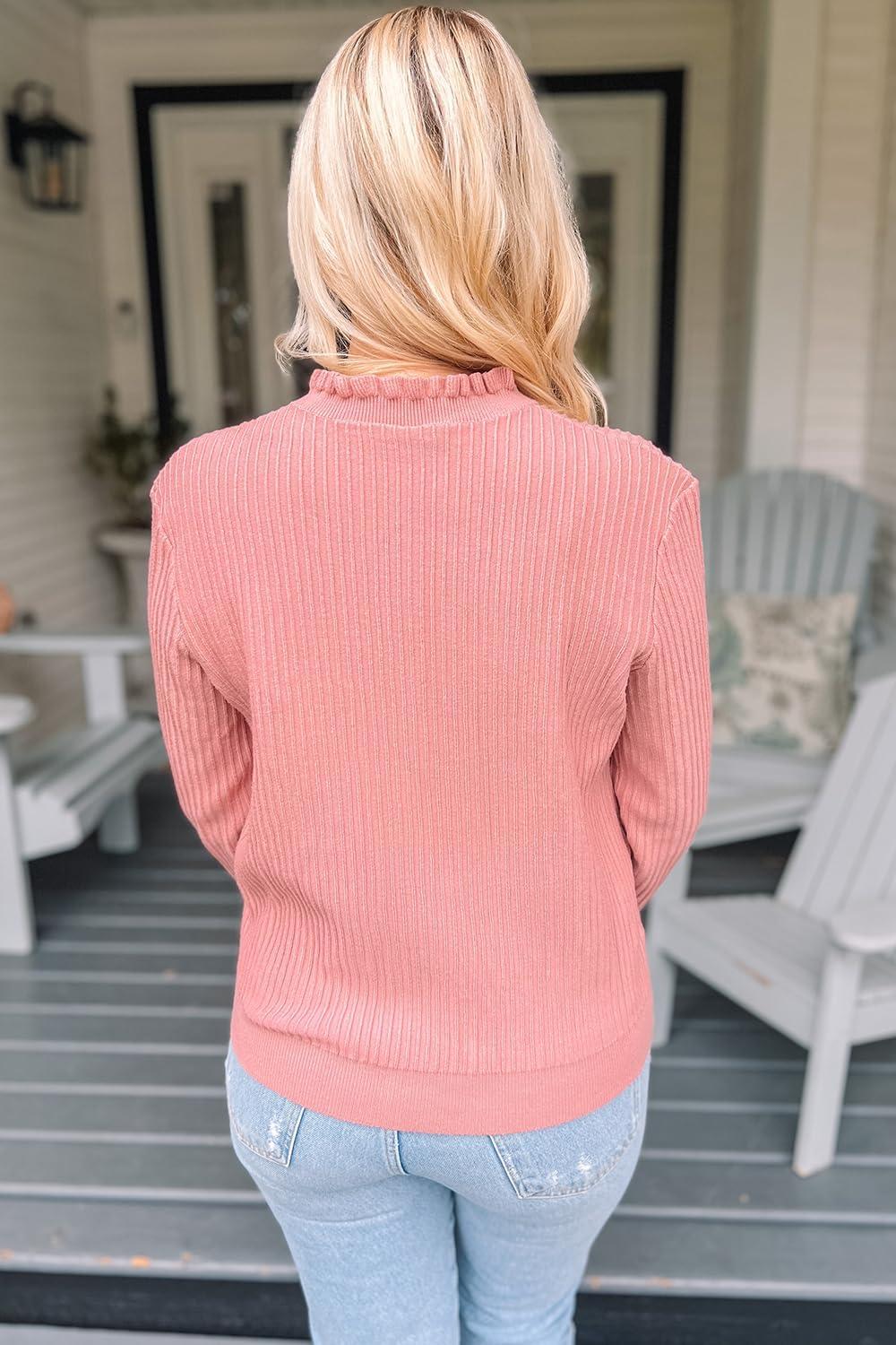 Arach&Cloz Womens Swaters 2024 Fall Fashion Outfits Long Sleeve Crewneck Knit Tops Ruffle Casual T-Shirts Cute Tees Blouses(Pink)