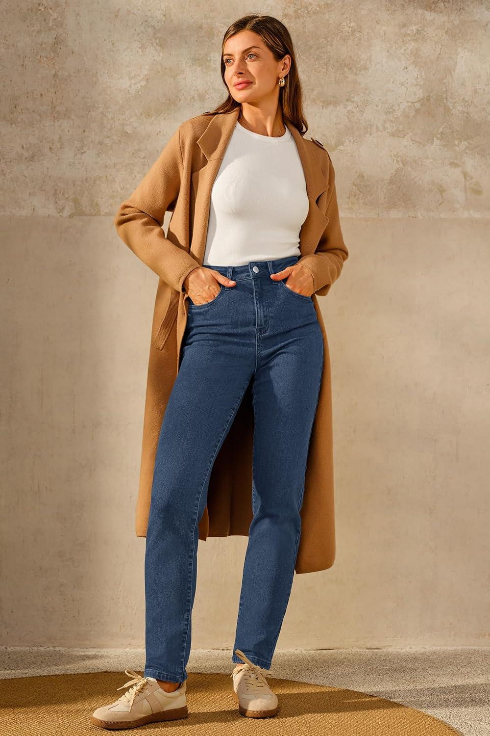 Arach&Cloz Women’s Thin Fleece Lined Jeans High Waisted Stretch Warm Straight Leg Pants 2025(Dark Blue)