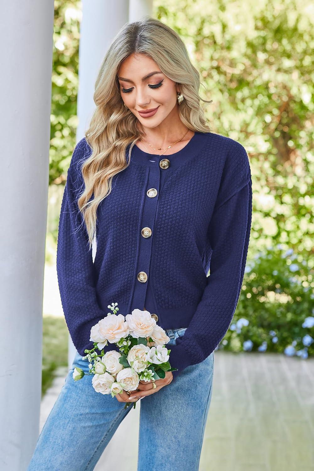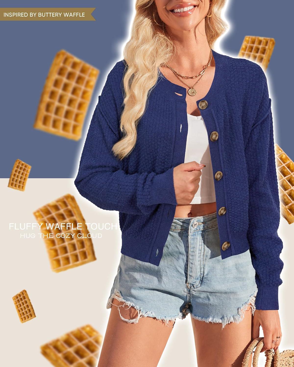 Arach&Cloz Womens Waffle Cropped Cardigan Ultra Stretchy 2025 Spring Soft Chunky Button Business Casual Sweaters(Blue)