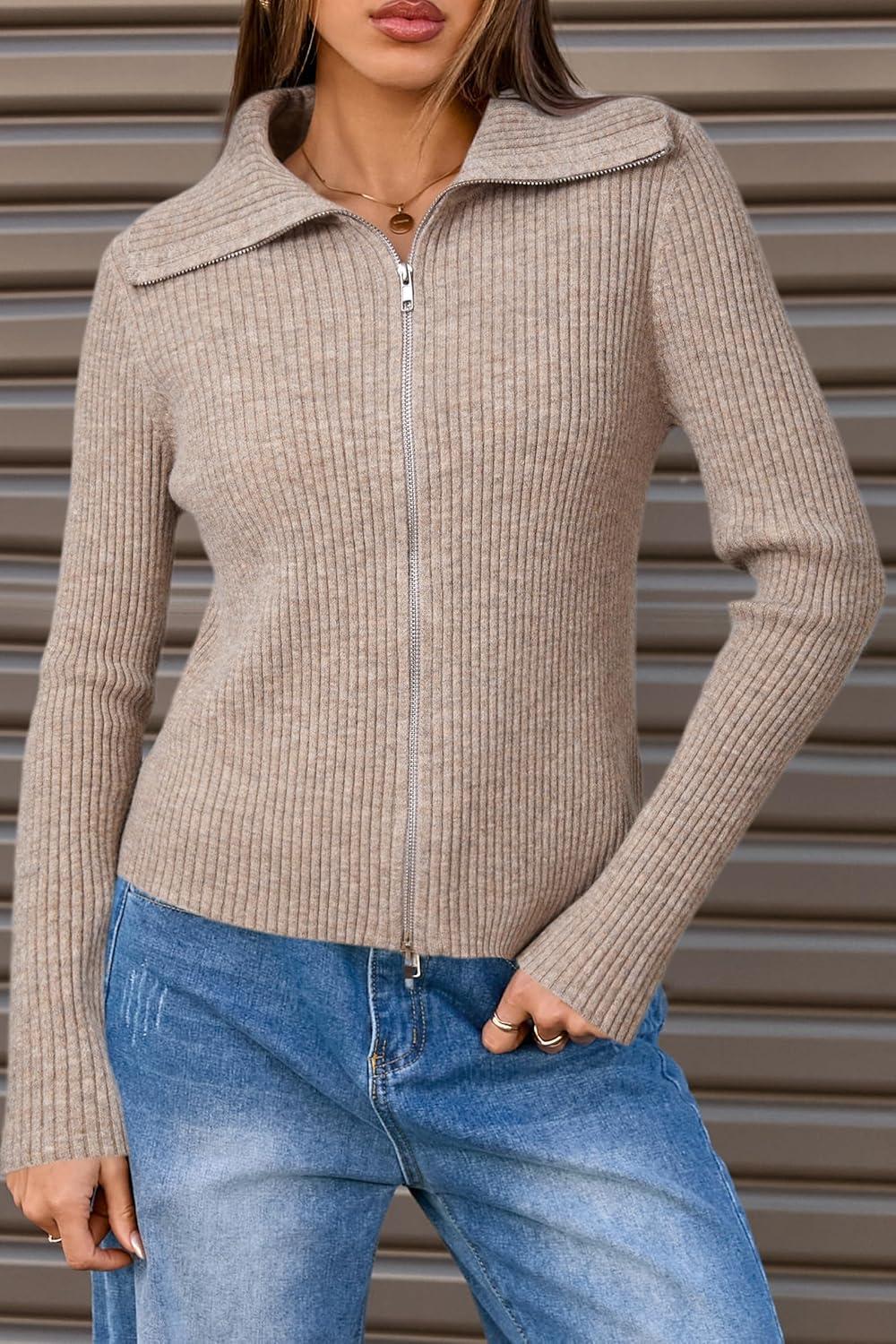 Arach&Cloz Women’s Wool Blend Fall Fashion Zip Up Cardigan Sweaters 2025 Trendy(Coffee)