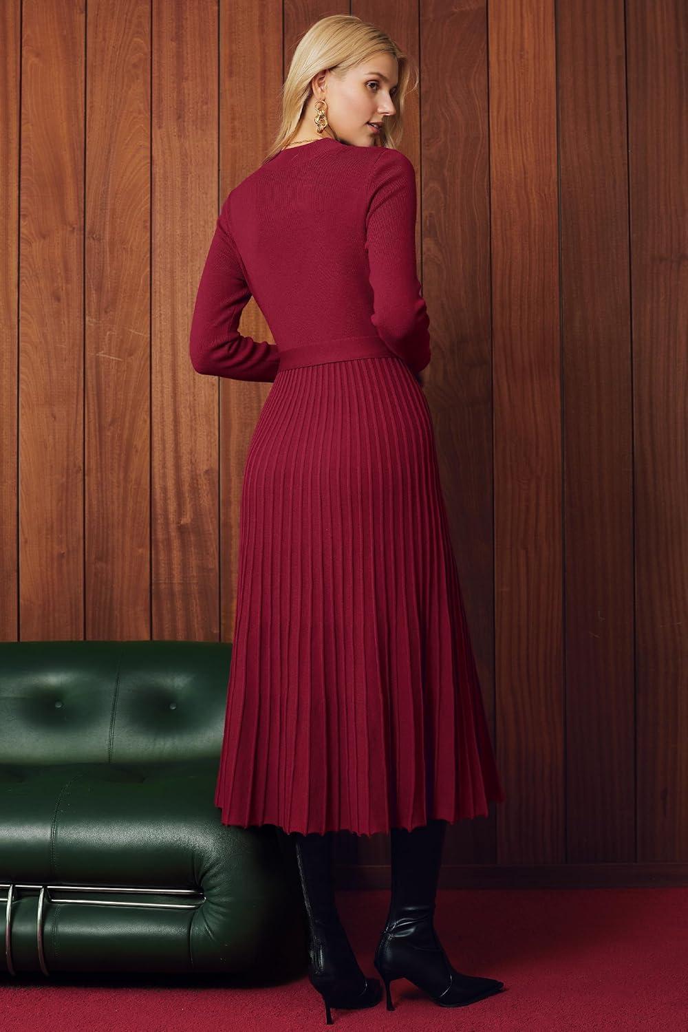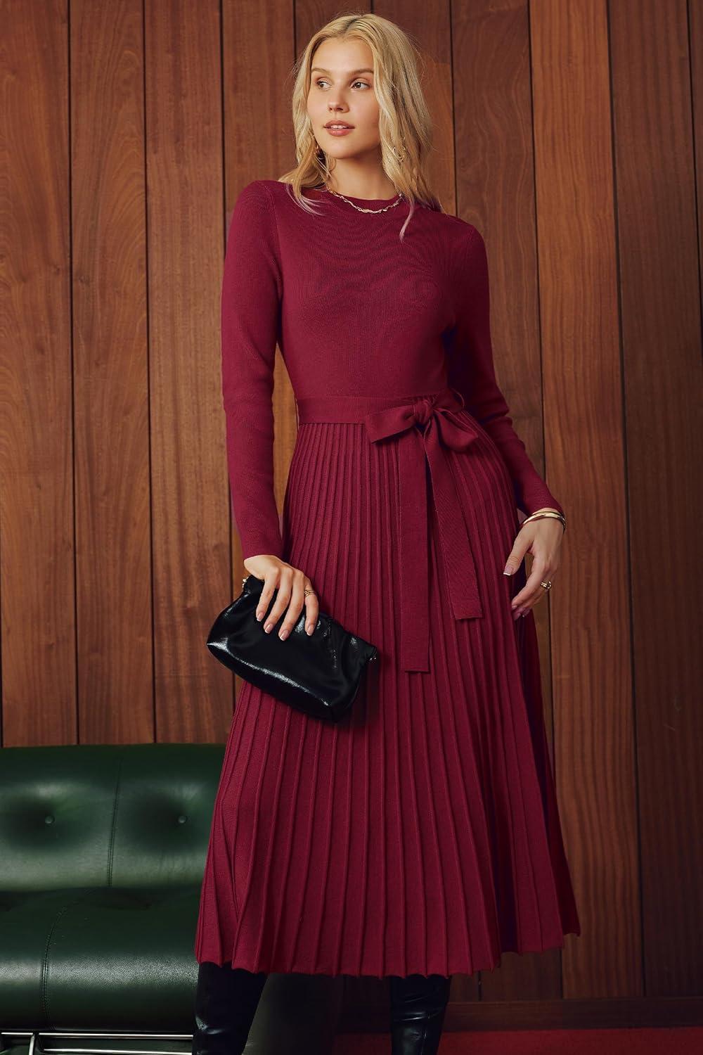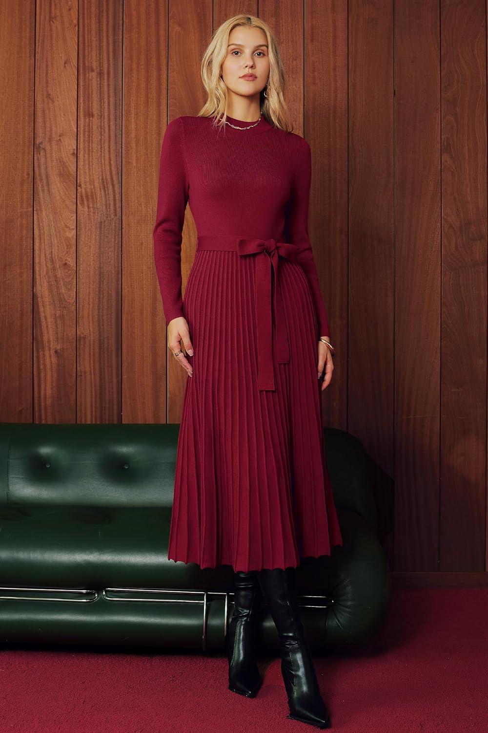 Arach&Cloz Women’s Wool Blend Mock Neck Tie Waist Fall Winter Pleated Sweater Dress 2025(Wine Red)