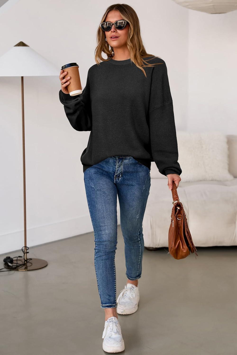Arach&Cloz Women’s Wool Blend Oversized Sweaters Crewneck Casual Fall Outfits Fashion Tops(Black Balck)