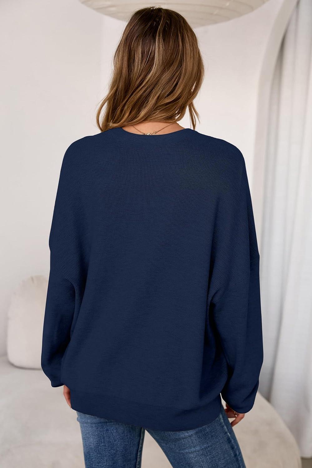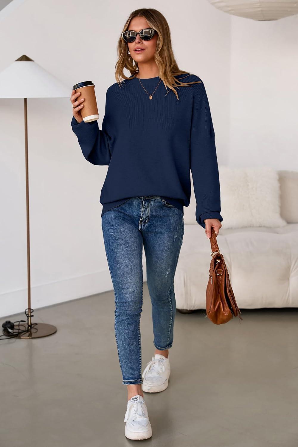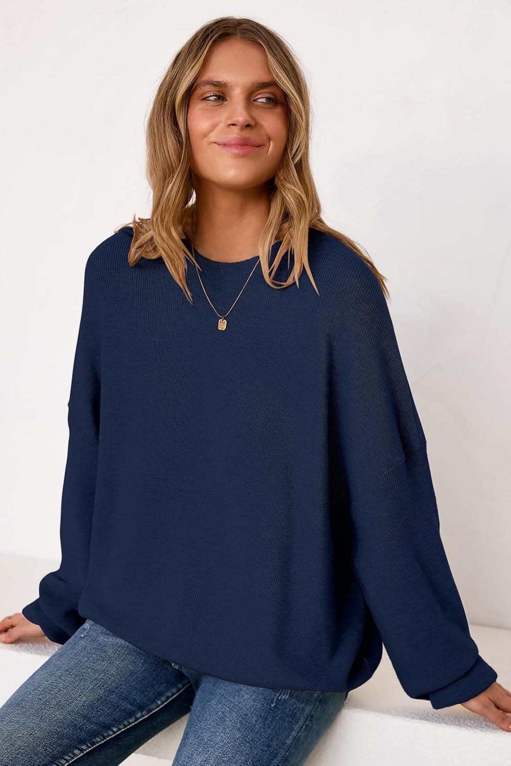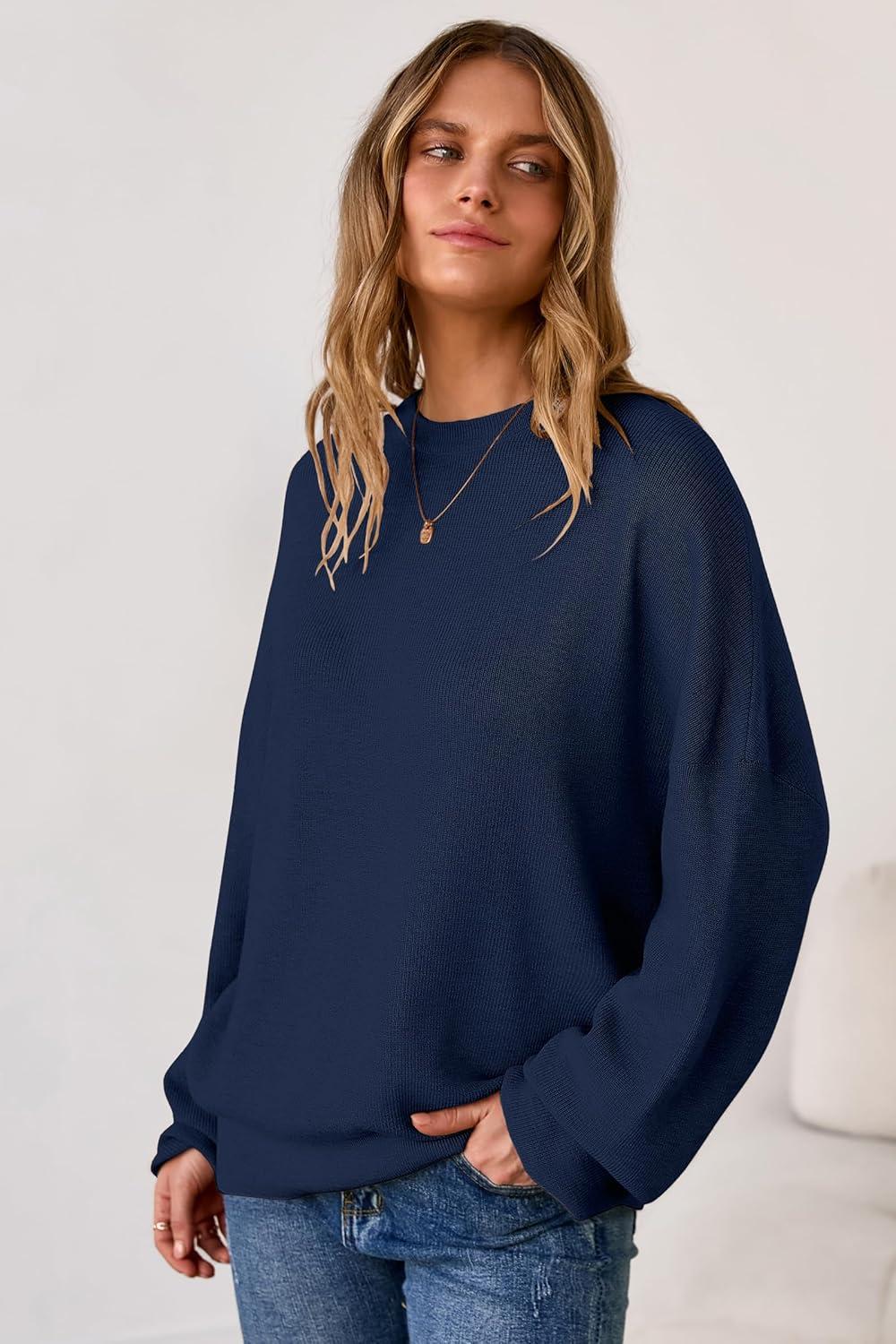 Arach&Cloz Women’s Wool Blend Oversized Sweaters Crewneck Casual Fall Outfits Fashion Tops(Navy)