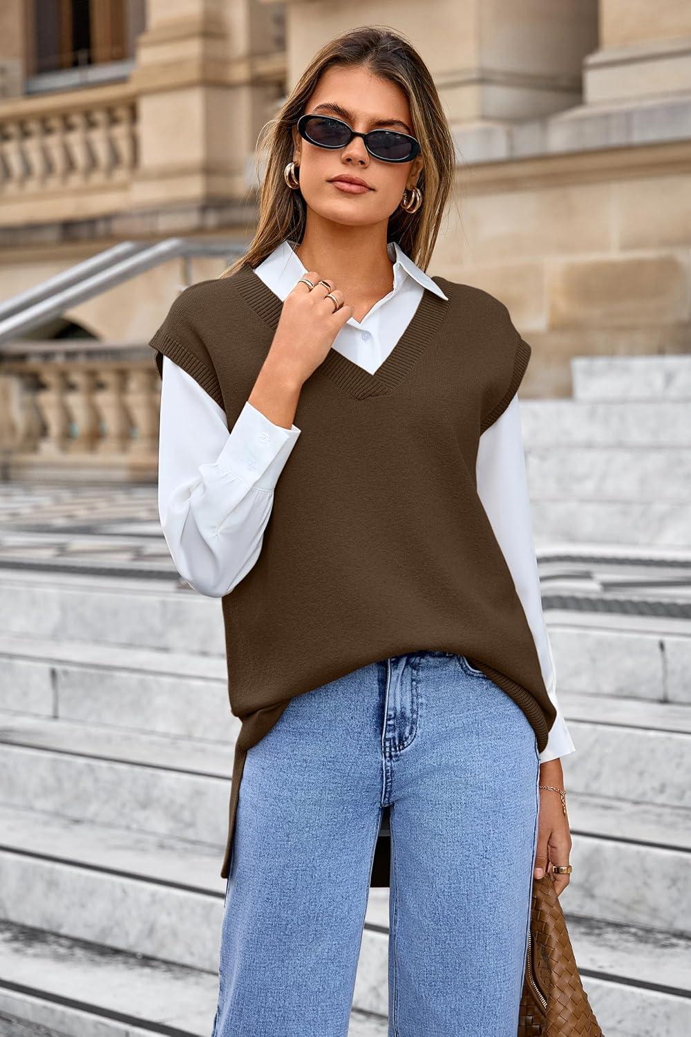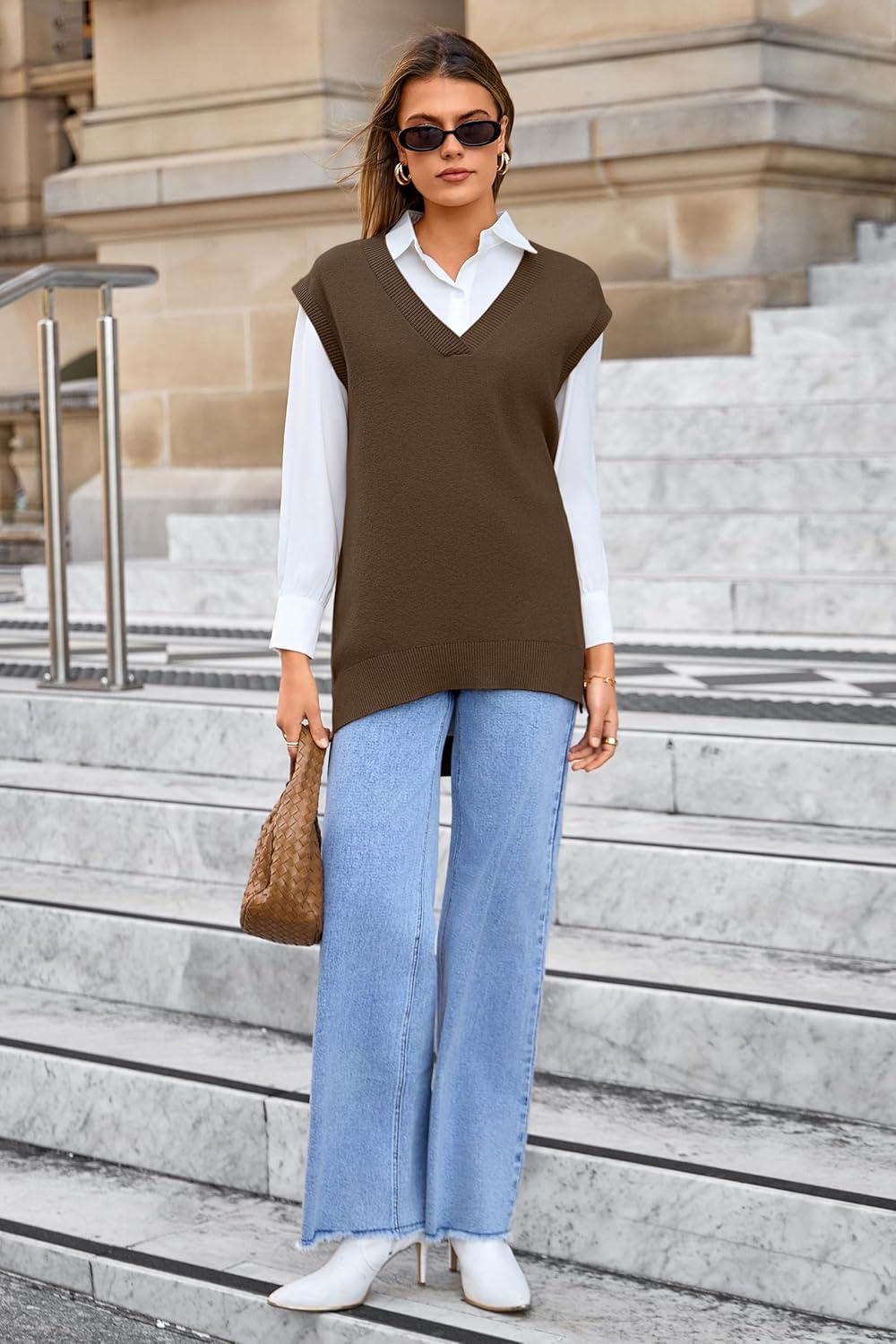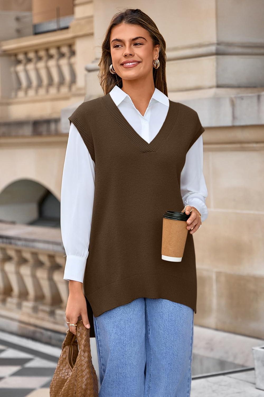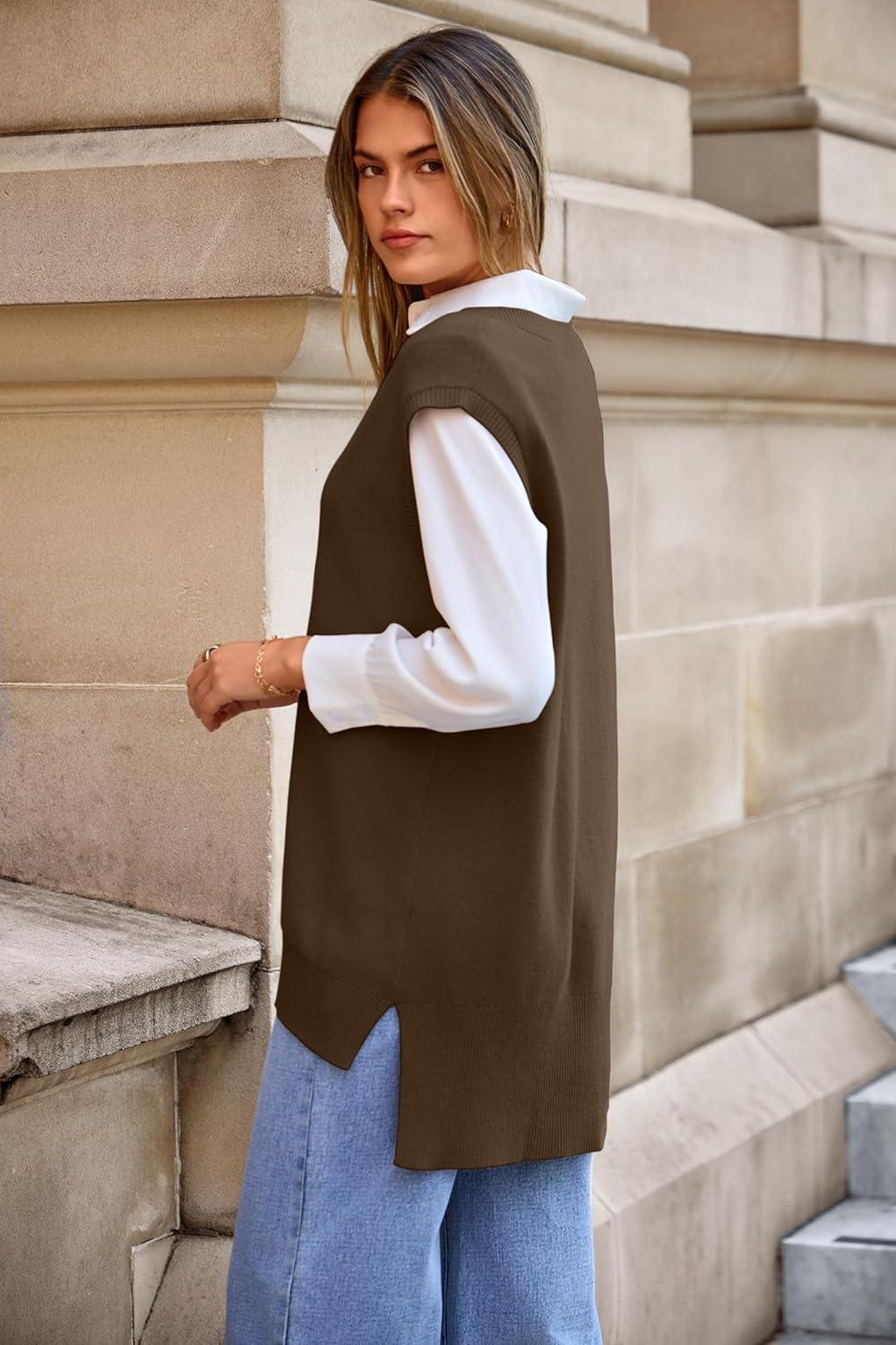 Arach&Cloz Women’s Wool Blend Side Slit High Low Versatile V Neck Fall Tunic Sweater Vests 2025(Brown)