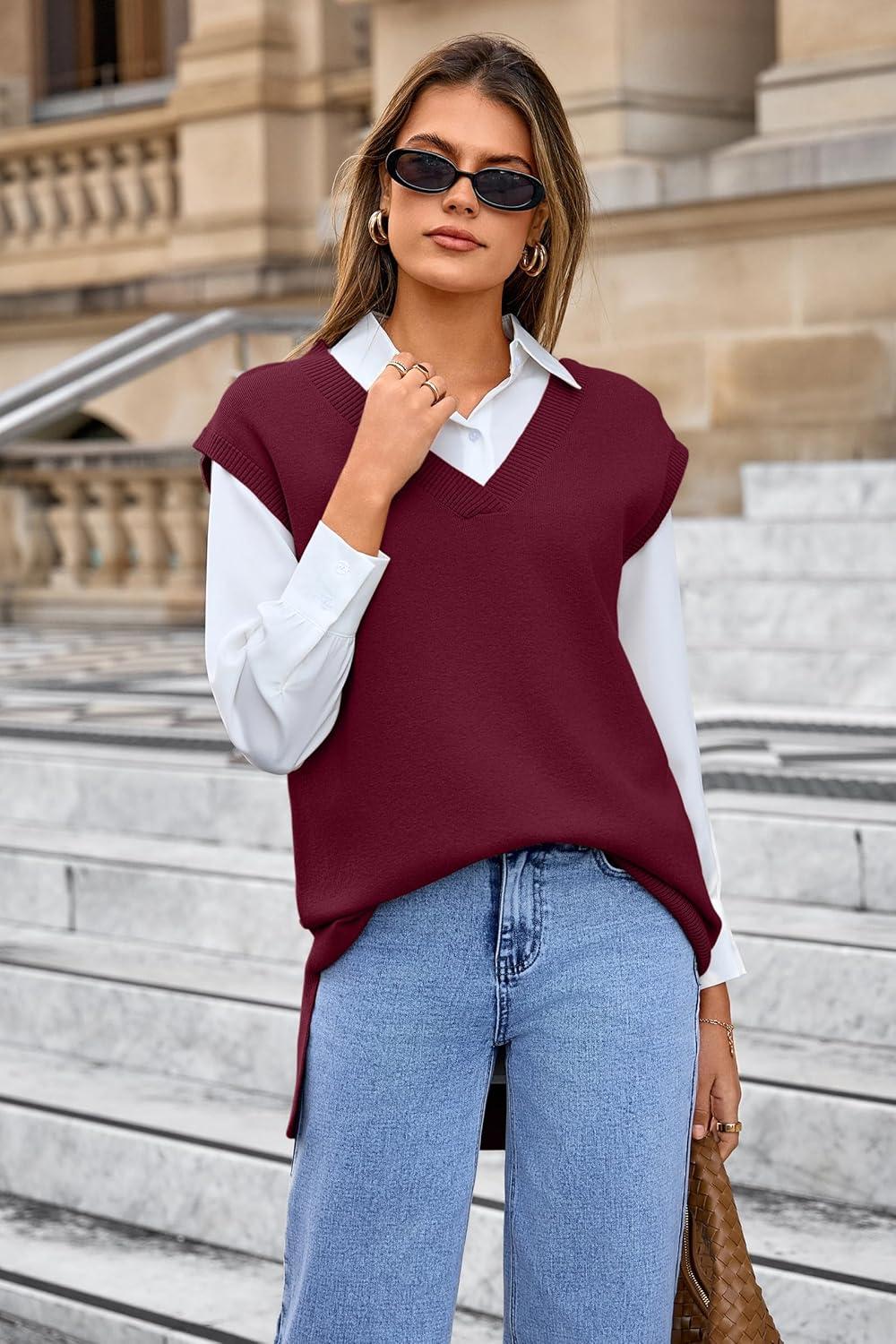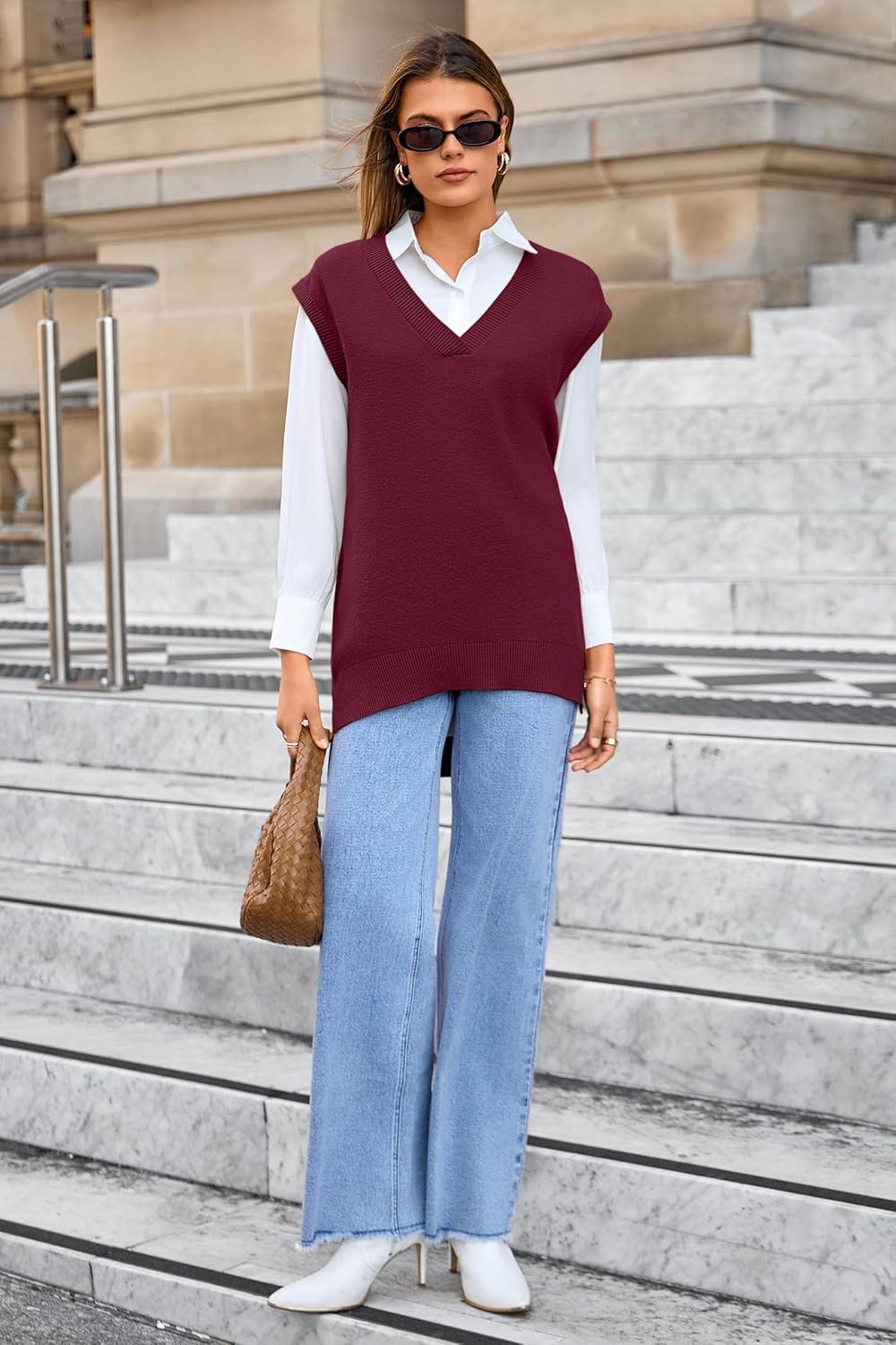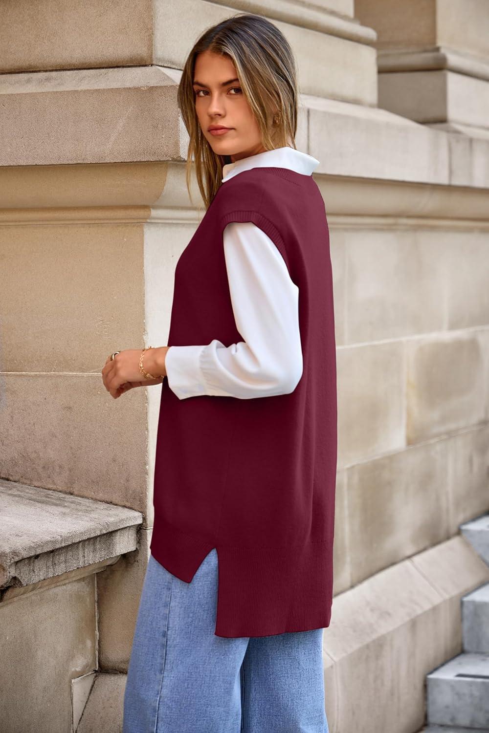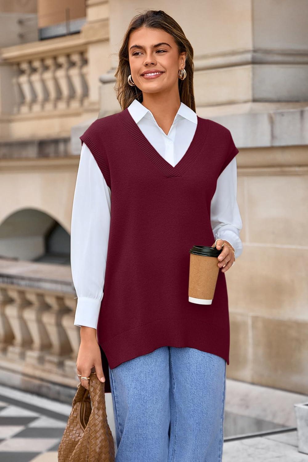 Arach&Cloz Women’s Wool Blend Side Slit High Low Versatile V Neck Fall Tunic Sweater Vests 2025(Dark Red)