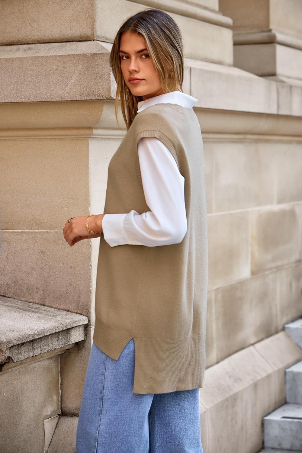 Arach&Cloz Women’s Wool Blend Side Slit High Low Versatile V Neck Fall Tunic Sweater Vests 2025(Khaki)