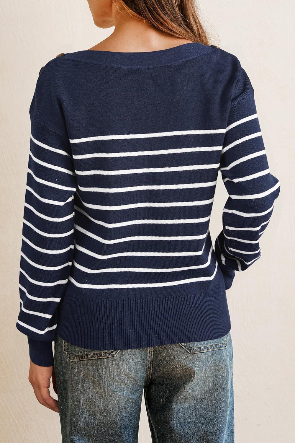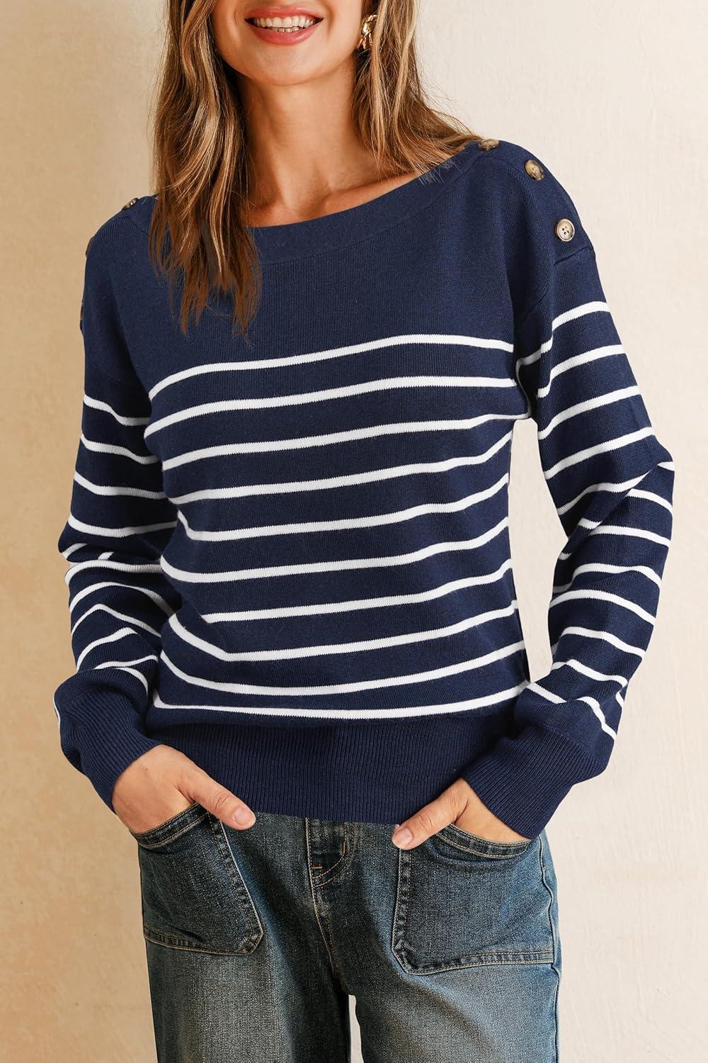 Arach&Cloz Women’s Wool Blend Striped Boat Neck Fall Dressy Casual Sweater Tops 2025(Navy Blue and White)