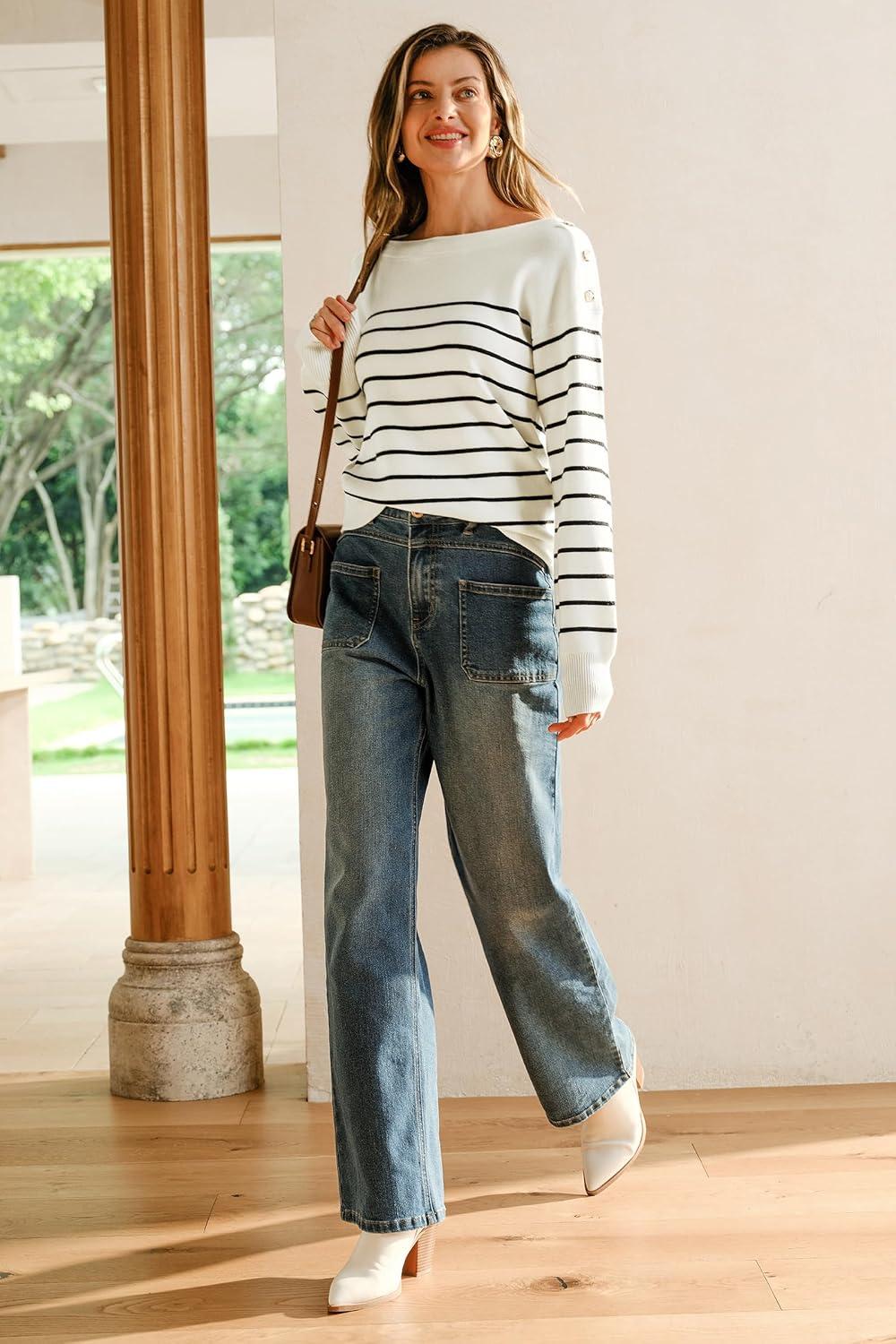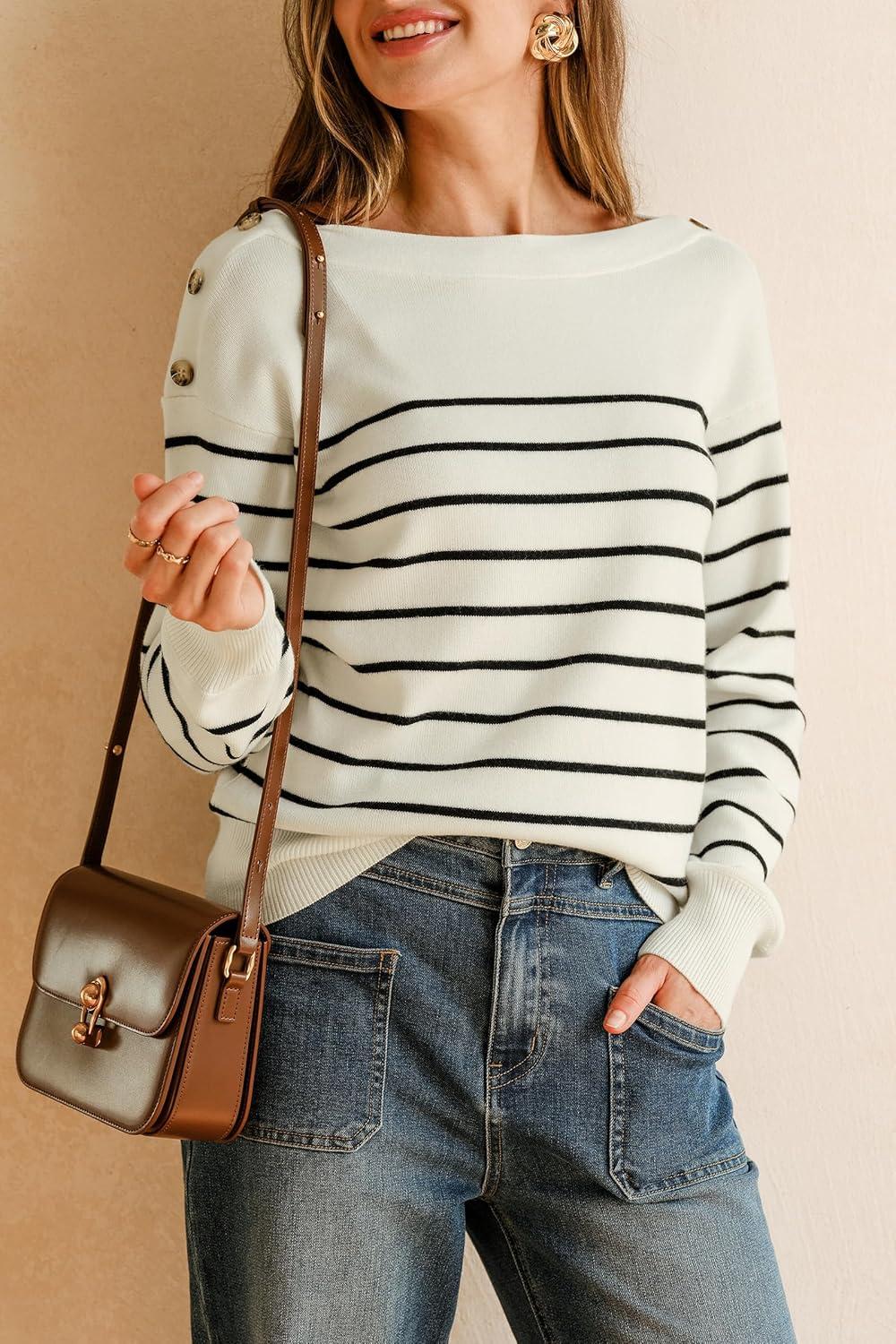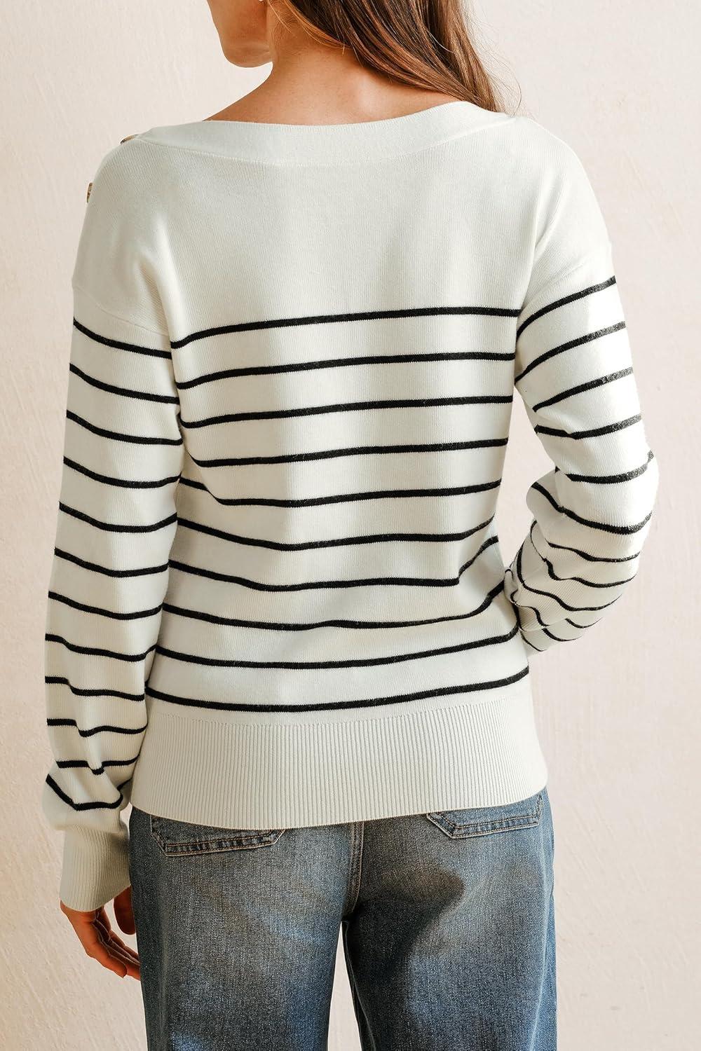 Arach&Cloz Women’s Wool Blend Striped Boat Neck Fall Dressy Casual Sweater Tops 2025(Off White and Black)