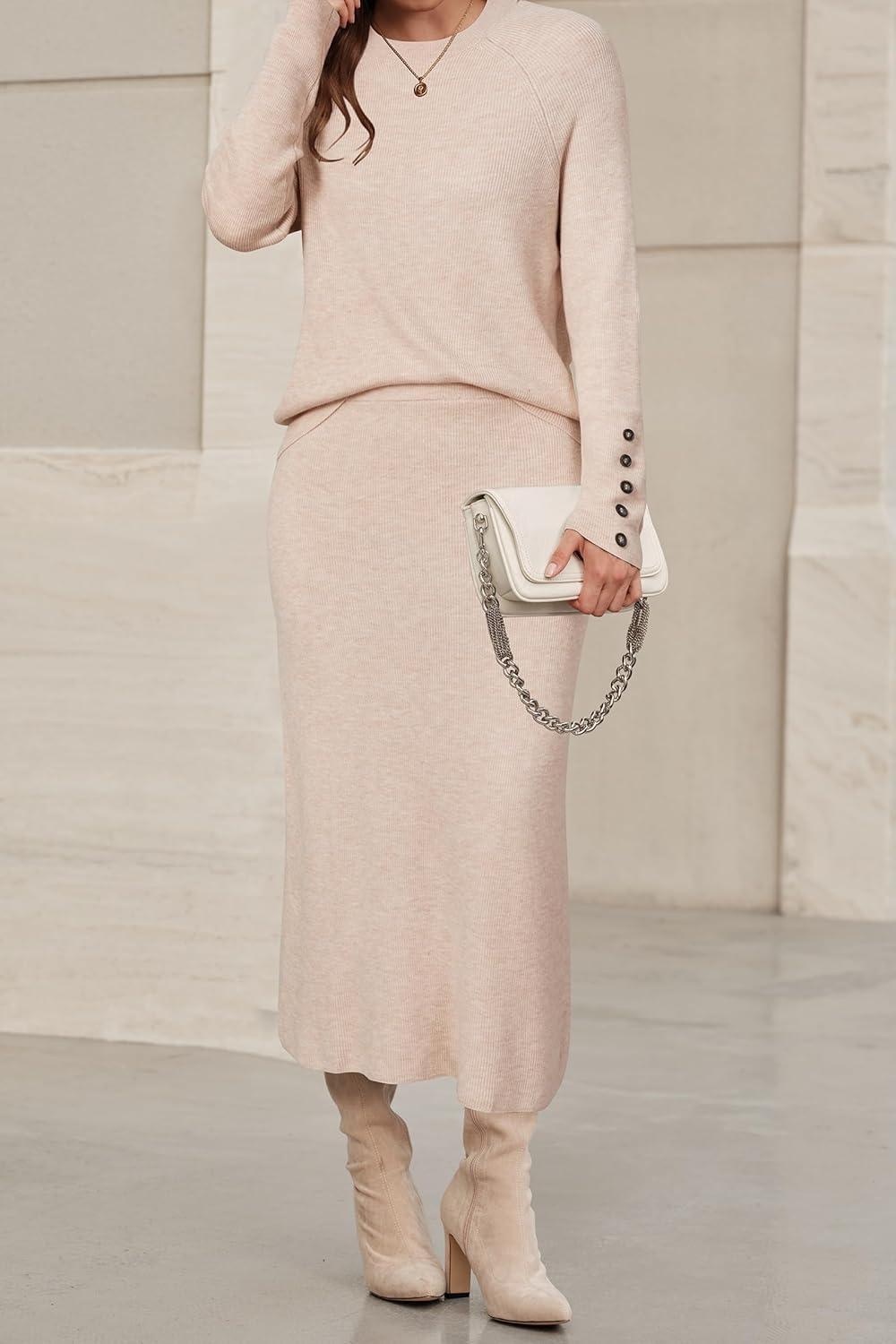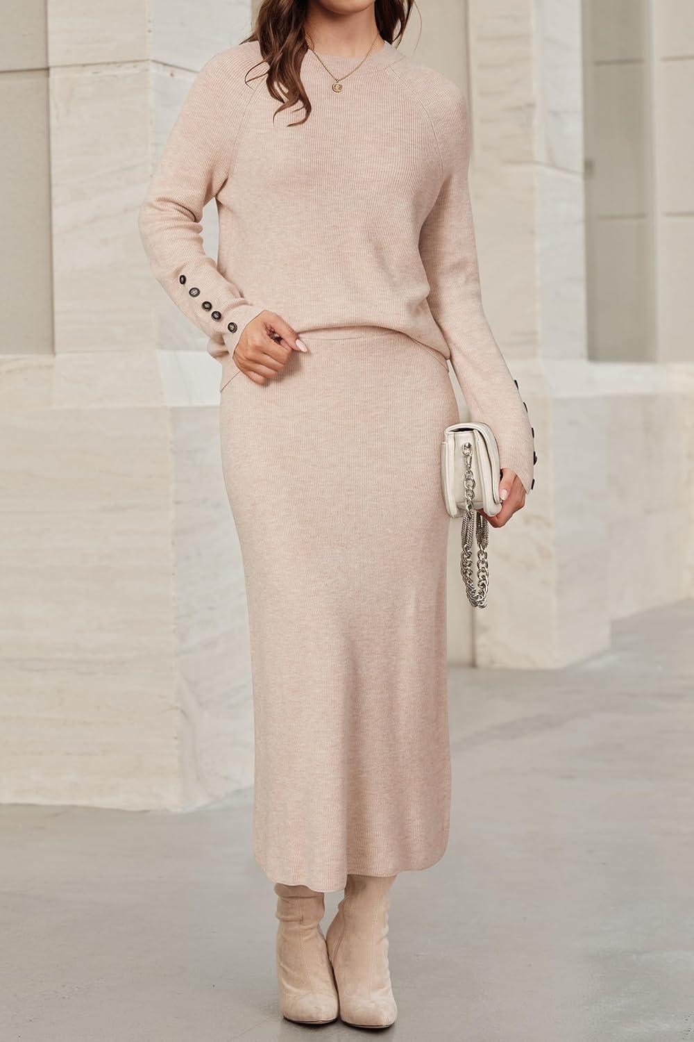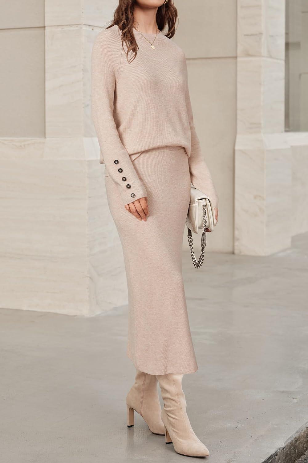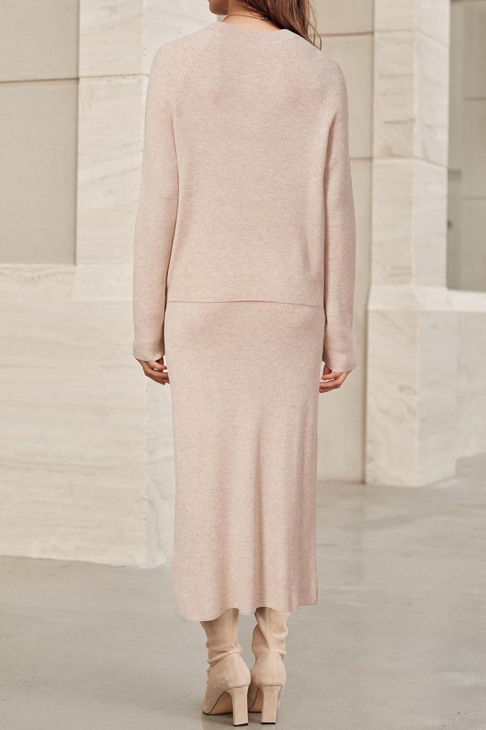 Arach&Cloz Women’s Wool Blend Sweater 2 Piece Sets Winter Business Long Sleeve Top Midi Skirts Outfits 2025(Apricot)