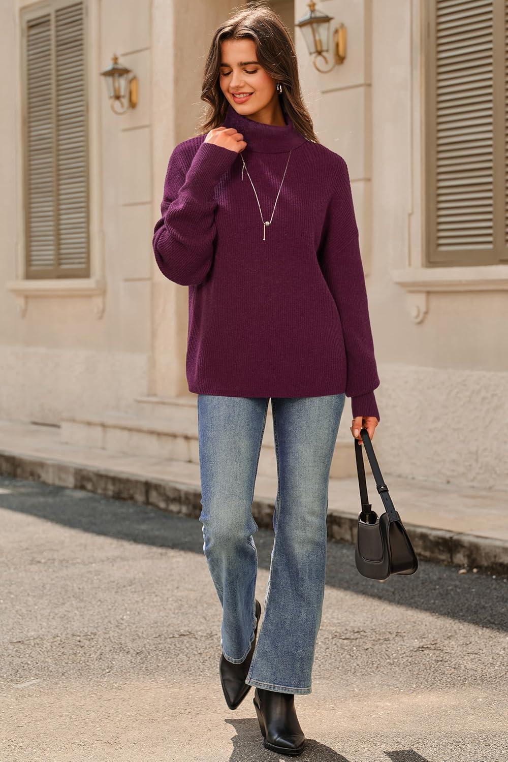 Arach&Cloz Women’s Wool Blend Turtleneck Fall Winter Casual Ribbed Oversized Sweater Tops 2025(Dark Red)